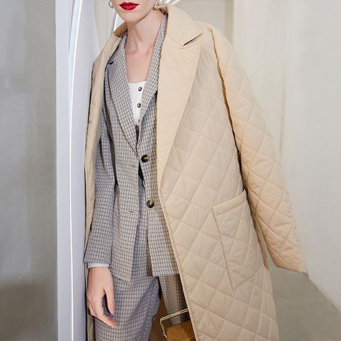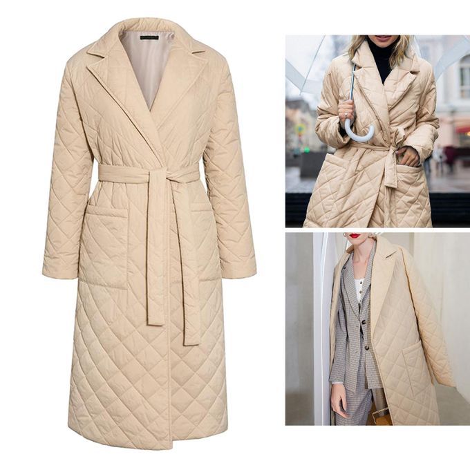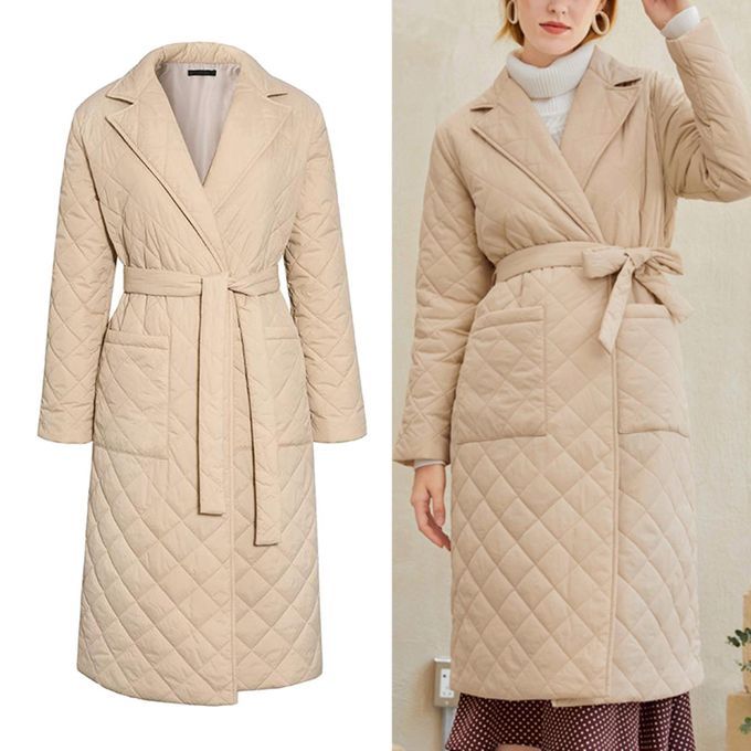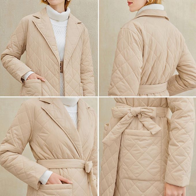 Lapel, long sleeves, large pockets and quilted rhombus pattern, belts, slim fit, can better highlight your figure and feminine curve in the cold and heavy winter.