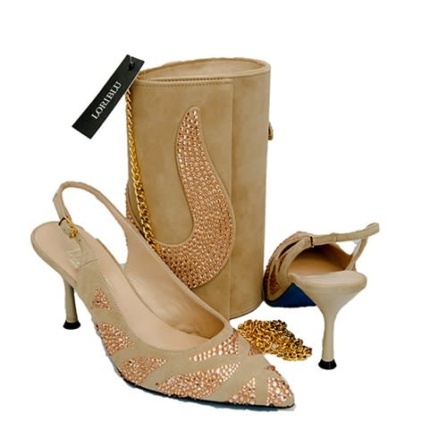 Loriblu are into production exclusive women shoe and bag is made from the finest quality high-end material; the shoe is made from suede leather and adorned with rose gold stone.