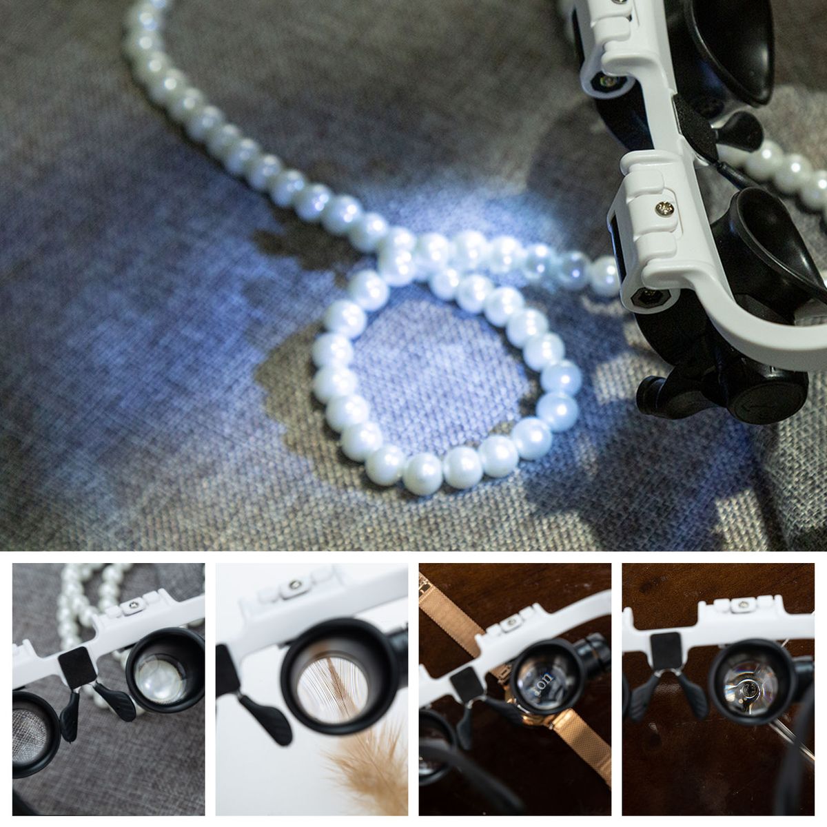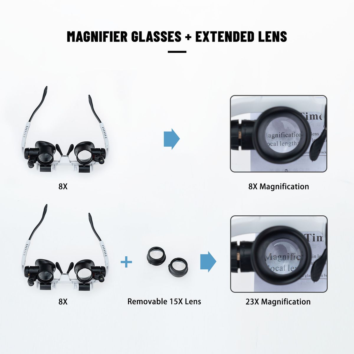 The 8X watch magnifier glasses with 15X extended lens has a magnification of 23. With adjustable LED light, you can wear the glasses for a more meticulous work such mechanical processing, jewelry appraisal, timepiece repair and micro carving.