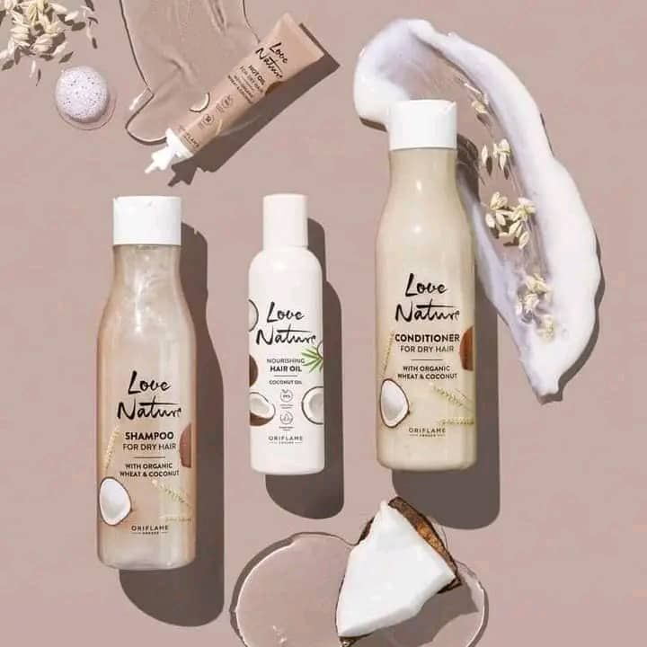 3 full size products of love nature hair treatment (shampoo, conditioner and hot oil) they are made of organic wheat and coconut. They work against hair breakage, wieght lose, and hair scanty and so much more.