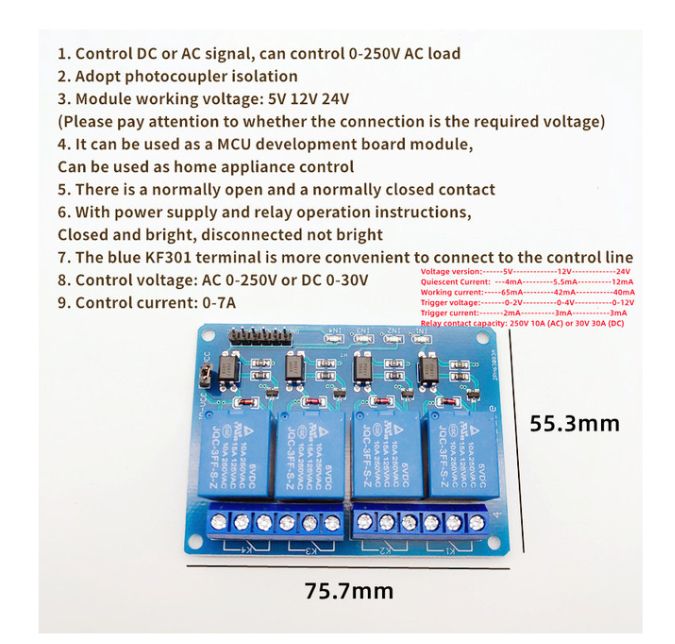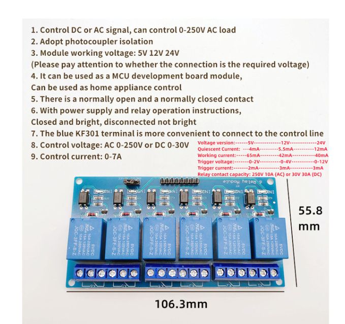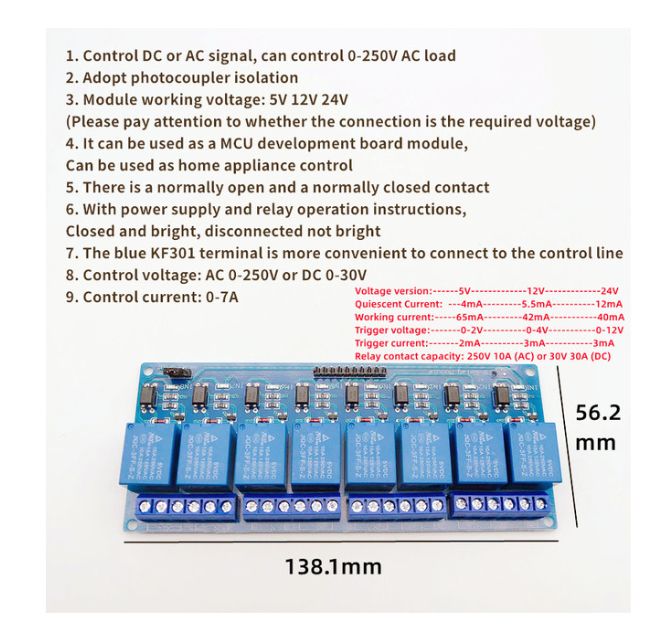 The relay module with optical coupler is 5V 1248 channel. Relay output 1248 channel relay module for Arduino