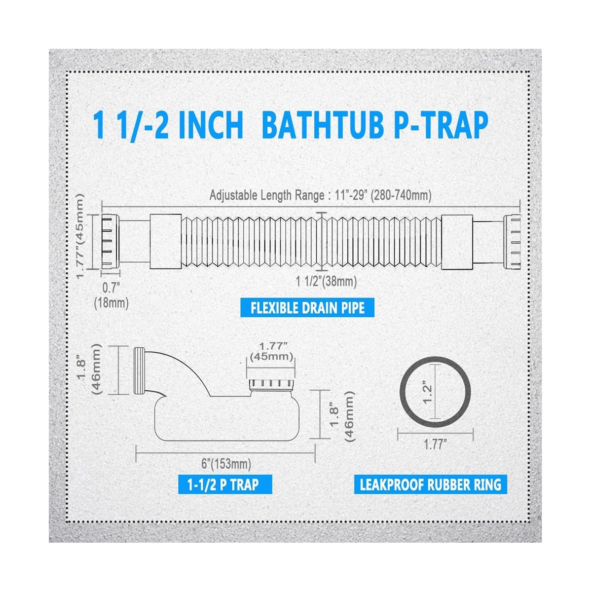 The low profile p-trap is one of the bathtub fittings. The nut at of the 1-1/2inch p-trap is connected to another 1-1/2inch threaded drain pipe. It is also suitable for some RV tub.