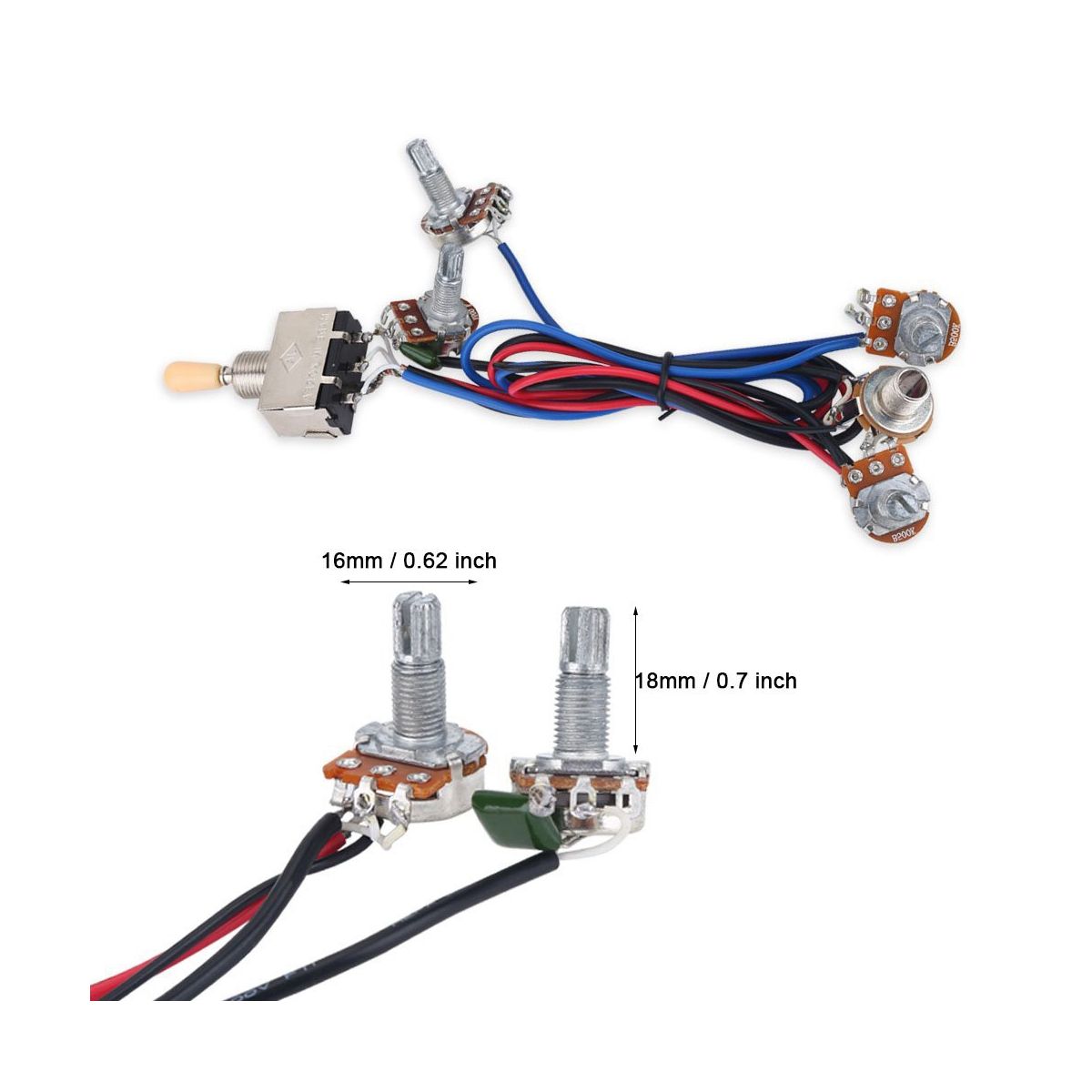 Pots Shaft length: . 18mm / 0.71 inch, Base diameter: . 16mm / 0.63 inch, Switch: . 18 x 28 x 49mm / 0.71 x 1.1 x 1.9 inch