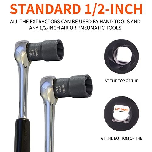 - DIMENSIONS - These twist soket nut extrators inludes 17MM, 19MM, 21MM, MM and 27MM bolt and a drift punh nut removal bar.