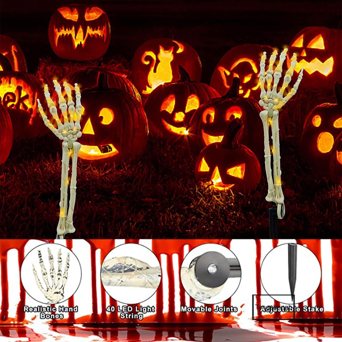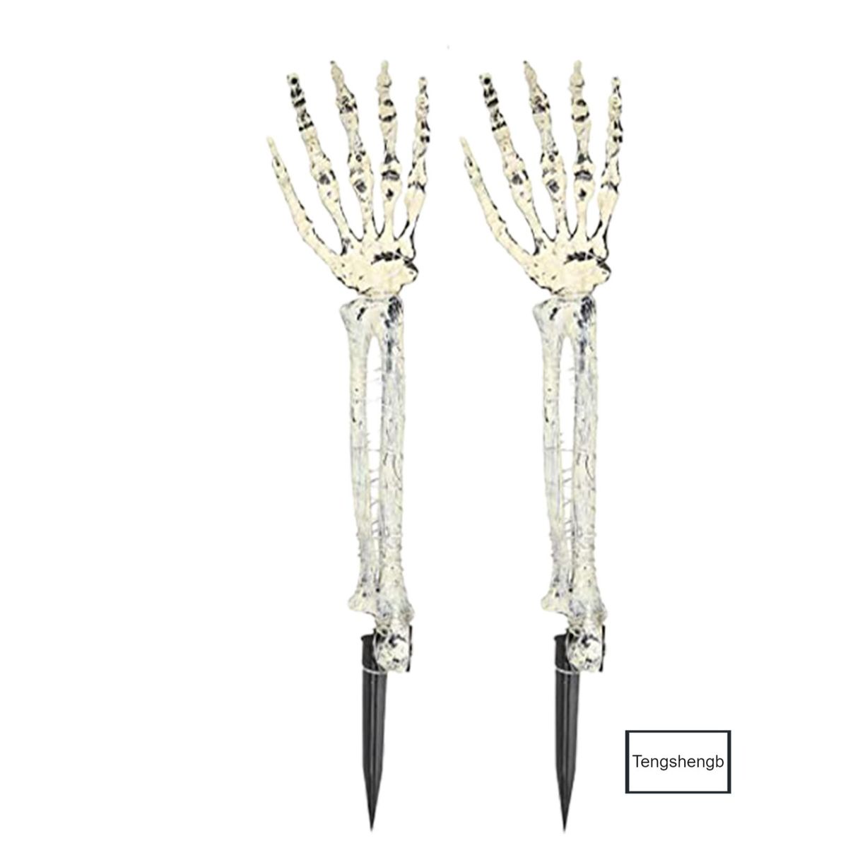 Glowing Halloween skeleton arm stakes .The mysterious lights are very in line with the atmosphere of Halloween; They will leave a deep impression on your visitors and your family.