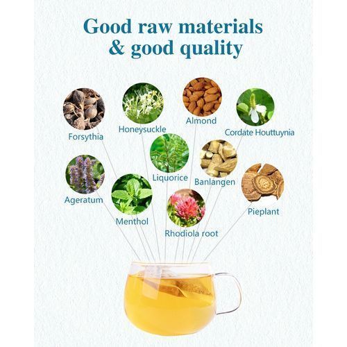 Main Ingredients Include:Forsythia, Honeysuckle, Almond, Banlangen, Cordata Houttuynia, Ageratum, Pieplant, Rhodiola Root, Menthol, and Liquorice