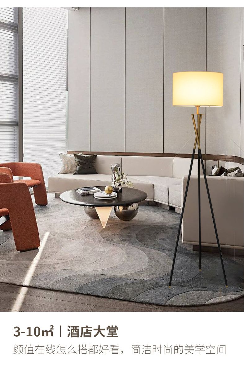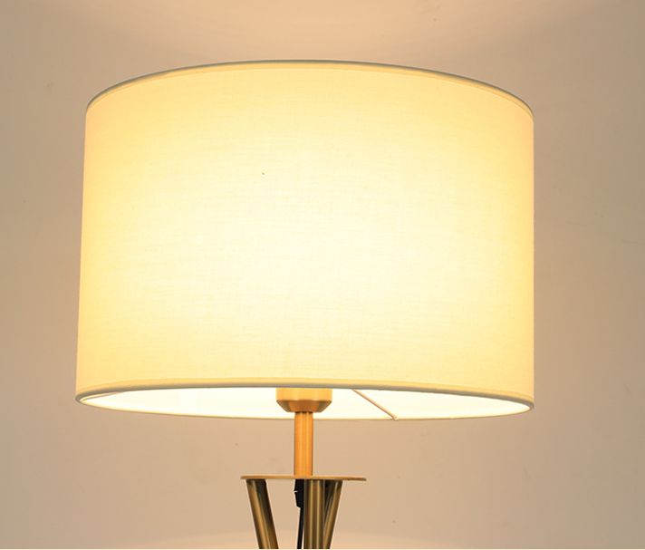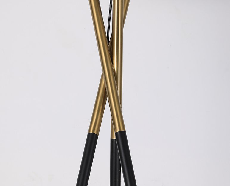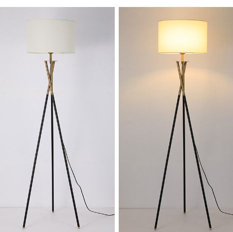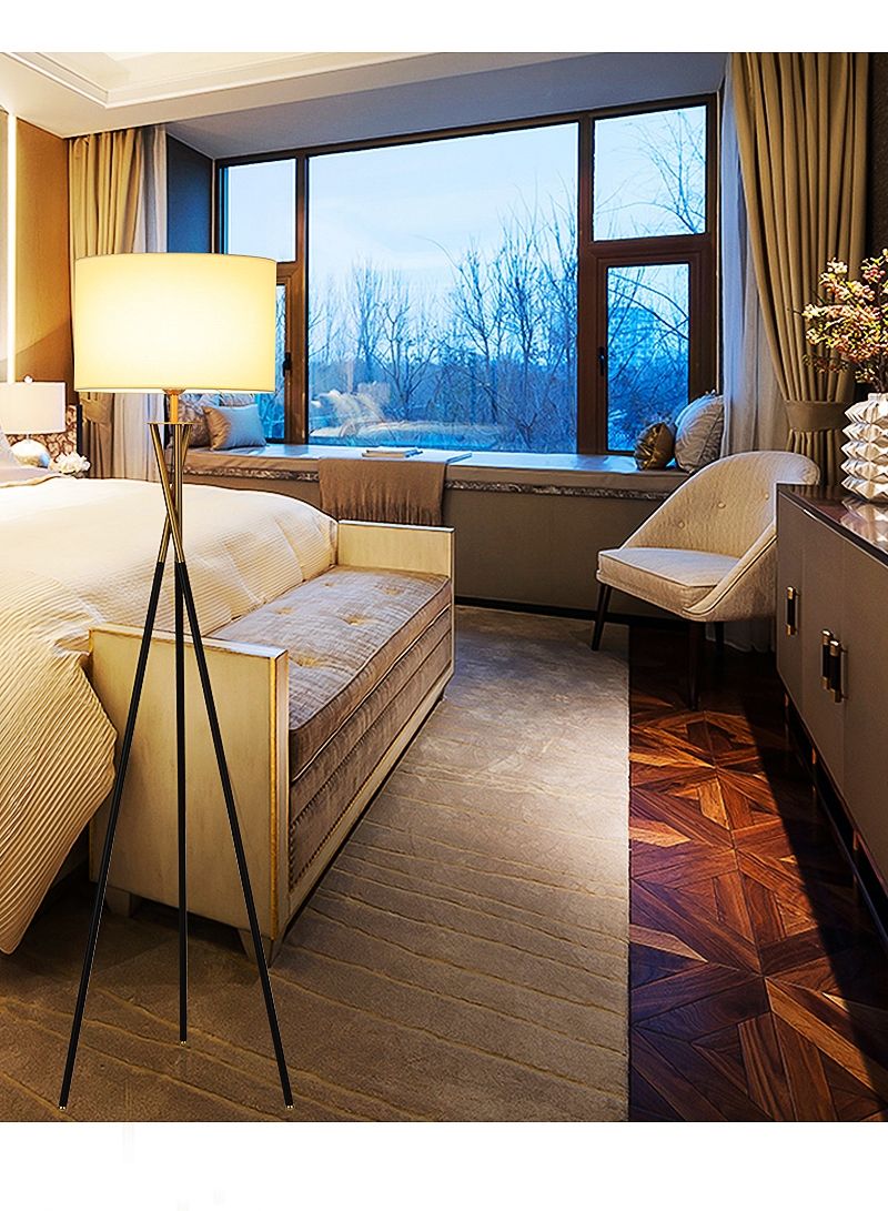 STANDOUT, MODERN DESIGN: Glossy standing tripod floor lamp with on/off foot switch provides a comfortable, warm glow that showcases elegance and beauty. Includes a sturdy black, gold mixed color legs and beige drum shade that sits perfectly atop three intersecting legs