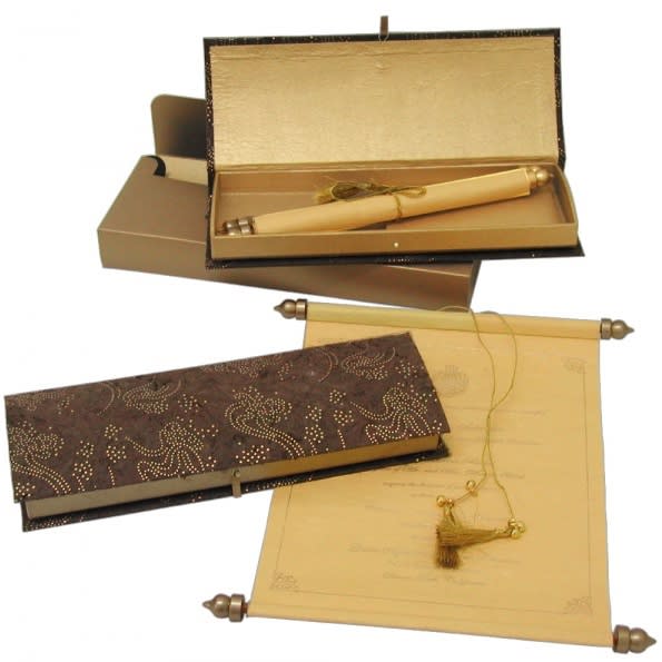 Cardboard box with outer finish in Golden Dew Drop print (hot foil printed) brown color handmade paper with golden lining; Scroll in Beige color handmade paper and mailing box in Golden color shimmery card stock paper.