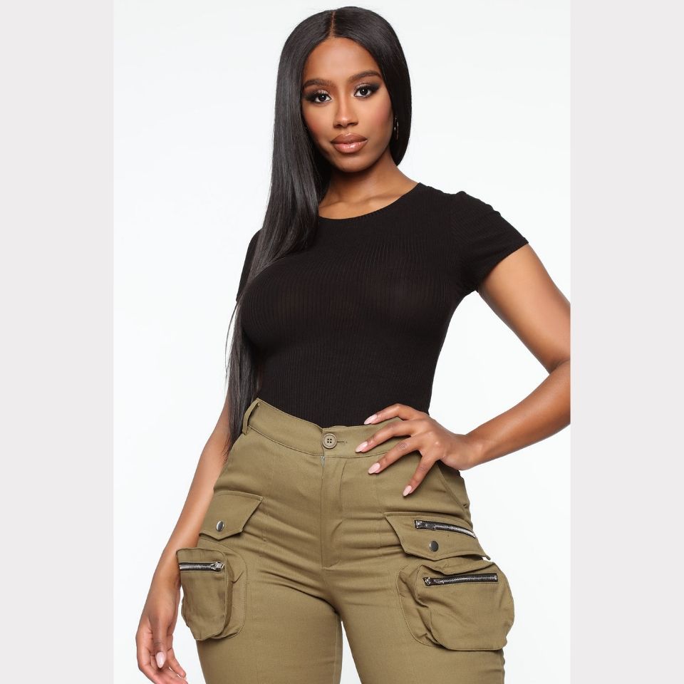 figure-flattering fit and with short sleeves, it is easily paired with any casual or weekend look. This bodysuit is the ultimate staple piece for all our dolls and is a must-have for you. Keep this look extra chilled with grey joggers and a puffer coat or dress it up with stiletto boots.