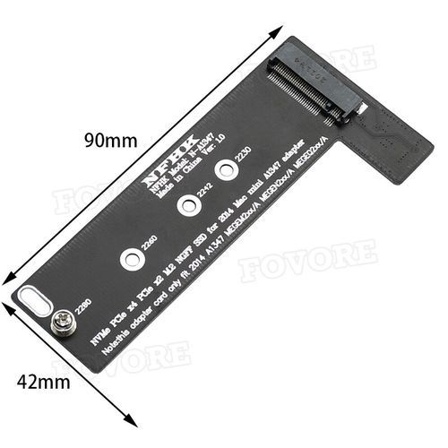 Item Description PCI-E x4 x2 M.2 M-Key NVME AHCI SSD Converter Card Adapter Raiser for 2014 Macbook Mini A1347 MEGEN2 MEGEM2 MEGEQ2 NVME SSD The adapter can covert the M-key SSD to the 2014 Macbook Mini A1347 MEGEN2 MEGEM2 MEGEQ2 SSD. Note: The Nvme SSD only work for Mac OS HiSierra. Note: The adapter only work for M-key SSD, cannot work for B-key or B/M-key socket. This riser card supports 2280 2260 2242 2230 PCIE x4 and PCIE x2 protocol M.2 SSD solid state drive converted to Late 2014 version of Mac mini A1347 (MGEM2xx/A MGEN2xx/A MGEQ2xx/A) model computer hard drive Note: PCIE x4 M.2 SSD is divided into AHCI protocol and NVMe protocol. For beginner level buyers, please use PCIe x2 or x4 AHCI hard disk. Experienced and capable buyers can use NVME protocol PCIe x4 M.2 SSD installation. About using AHCI protocol hard disk or NVME protocol hard disk, this is your own technical problem, has nothing to do with the adapter card, Sorry that we can not provide technical support! Novice buyers are advised to purchase PCIe x4 M.2 AHCI SSD that work with this adapter card! Compatibility With: 2014 Macbook Mini A1347 MEGEN2 MEGEM2 MEGEQ2 Summary of reasons why the hard disk cannot be recognized: 1. The interface of the adapter card is not inserted into the socket of the computer. It can be used with a little force. And very ant thing is, Please ar preing it in. Because if it is not flattened, some contacts will not be touched, so the computer will definitely not recognize the hard disk. 2. The hard drive is wrong, some buyers use the SATA protocol M.2 hard drive to install, certainly not. 3. The system installation disk must use version 10.13.6 or higher, some buyers use 10.11 or 10.12 or even 10.10 to install, this is not acceptable, because these old version syst do not include NVME drivers. This is the same as the system. If you use the NVME protocol hard disk and make a Windows 7 system, you will definitely not recognize the disk. (Of course, you can install the Windows 7 system by patching. The old mac system can be patched. Use, but it is very troublesome). 4. The hard disk partition format is wrong, it is not recognized when installing the system, you must have GPT (GUID) partition format. 5. Do not install the system from the network, do not try to use your backup to restore the system, because the old and new versions of the system disk formats are not the same! Honestly download the system, do a 10.13.6 system installation disk, install from the USB disk, this is the only way! To restore your system information, I can tell you a way of thinking, (because one buyer friend said ok, but I have not actually done it, I don't know the specific details, this idea is for reference only, I can't provide technical support! ) The method is as follows: You can use your system to install the disk, upgrade your computer system to version 10.13.6, and then make a backup, and then use the USB flash drive to restore the system ar installing the new hard disk. 6. The speed test on the picture of this product is the hard disk using Samsung PM961 on the actual measurement, the data is for reference only, not as a receipt basis, because the LATE 2014 version of the mac mini computer itself only supports PCIe x2 speed, resulting in a large discount on the hard disk speed. This is not a problem with the transfer card. You use the hard drive cable of mac mini, which is the same result. What's Include 1 x NVME M key M.2 to 2014 Macbook Mini A1347 MEGEN2 MEGEM2 MEGEQ2 SSD Adapter Card Product pictures
