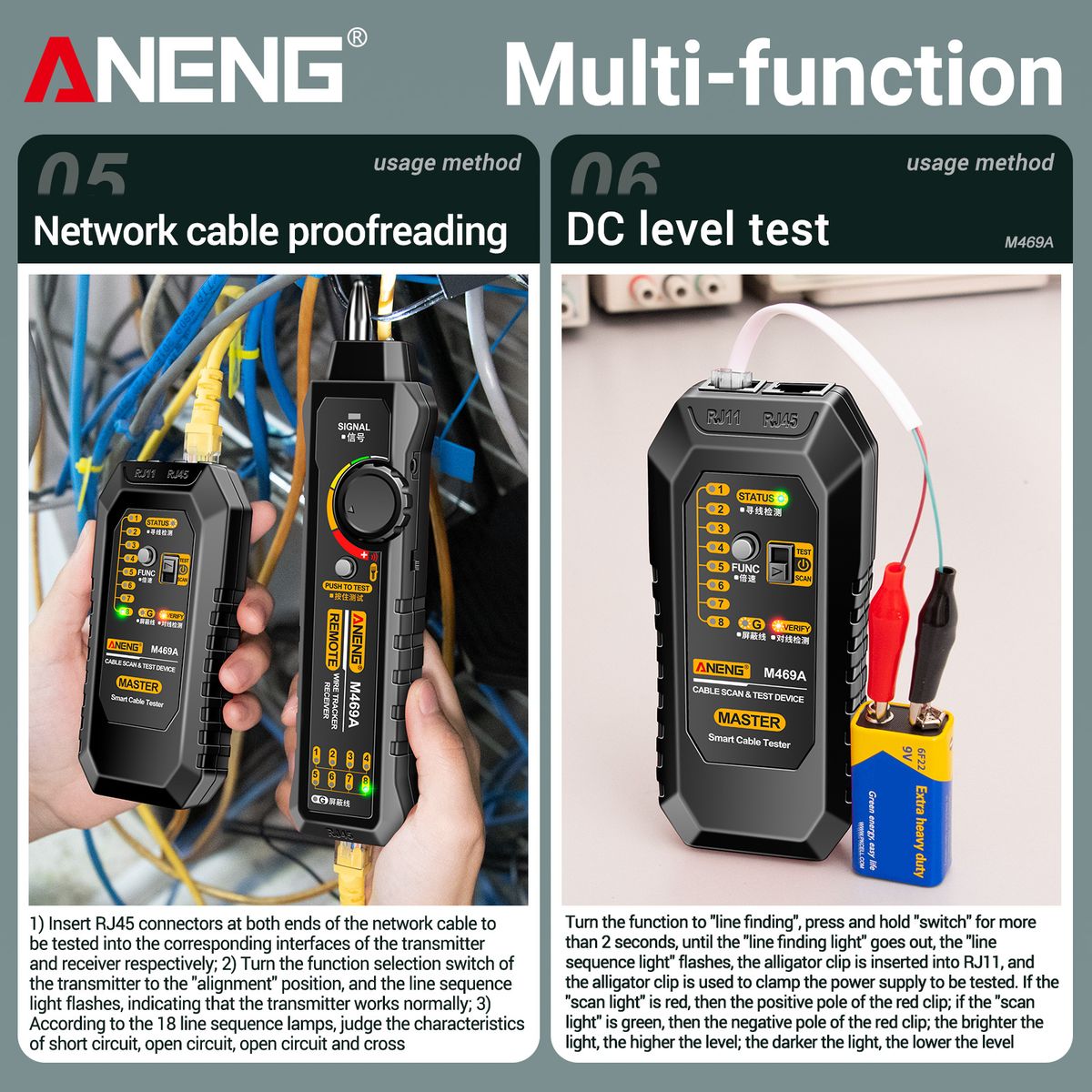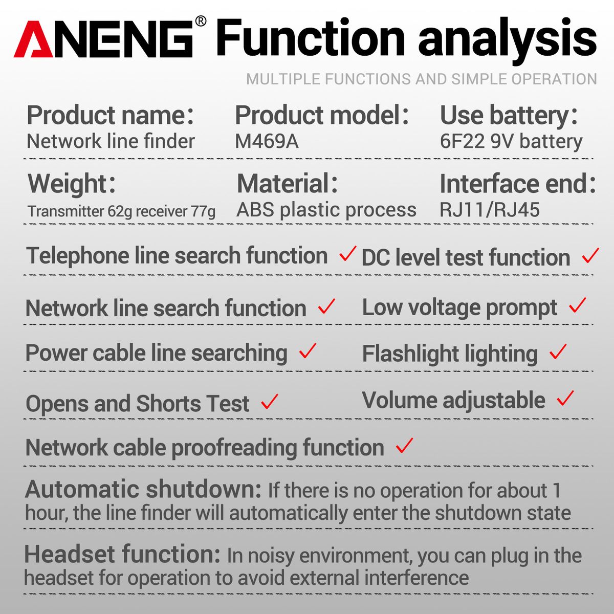 Multi-Functional: There are open circuit of short circuit testing function, telephone wire finding function, tracing cable function, level testing function ( 3~10V), network line finding function, network cable proofreading function, etc.