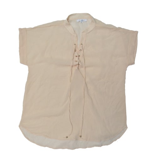 Blouse Hanna in a wide model with ruffles at the front of the waist. Half-length sleeves with dropped shoulder seam with ruffles. Round neckline with a deep slit and button at the neck. Made of woven chiffon. Lined thin at the top. Length 58cm in size 36.