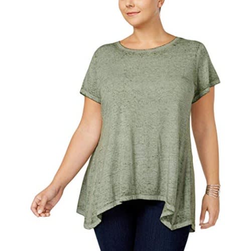 Burnout fabric and a handkerchief hem elevate this plus size T-shirt from Style & Co, offering a plain design all-over, making it fashionable to wear. This T-shirt features a scoop neck neckline, Burnout fabric; handkerchief hem & loose fit, short sleeve and regular fit for a plus size lady/woman. This T-shirt is designed in a loose fit for comfort guaranteed, perfect for casual walk & it can be paired with a jean for a stylish look. It's a must-have in your wardrobe! It features a Scoop neckline,