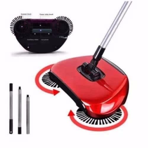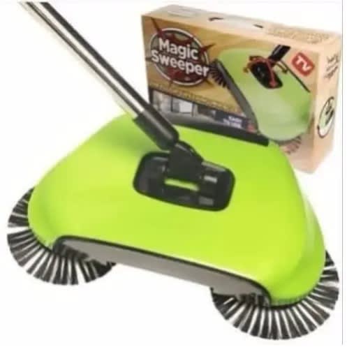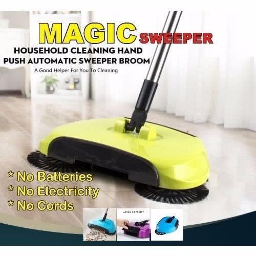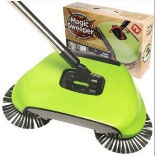 his Magic Sweeper & Broom is a rotating hard floor sweeper that does the job of a vacuum in the form of a broom/dustpan, WITHOUT electricity or batteries!