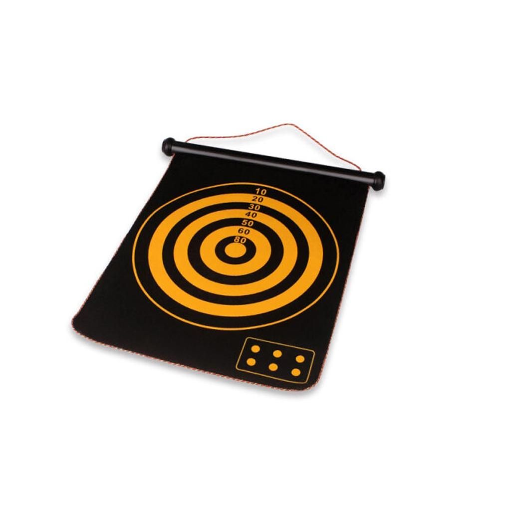 Double sided magnetic dart board, with 6pcs darts (3pcs red and 3pcs yellow).It can rolls up to store conveniently and just as easily unrolls to back up. Traditional dart board on side, target game on the other.Portable hassle-free design, you just need to the dart board on the wall, then you can start the dart game.Magnetic dart board is made of high quality material. When your dart hits the dart board, darts get stick immediately as they land on the board without slide or fall.We use magnetic darts with flat ends instead of sharp metal points, which are safe for children to play, and no need to worry about damaging the wall.