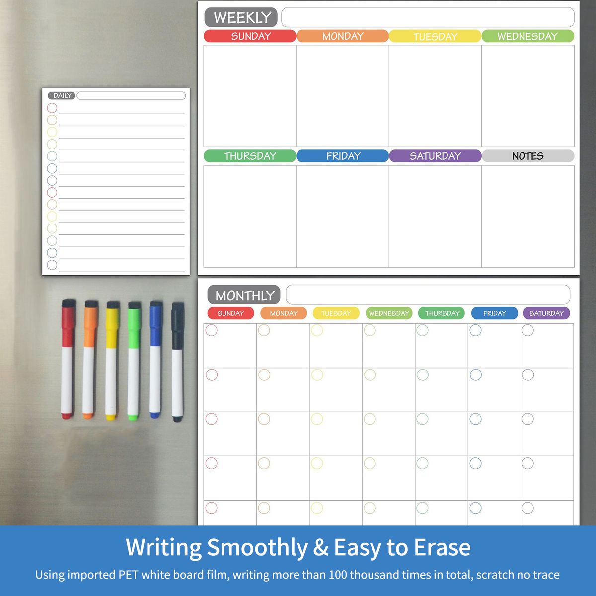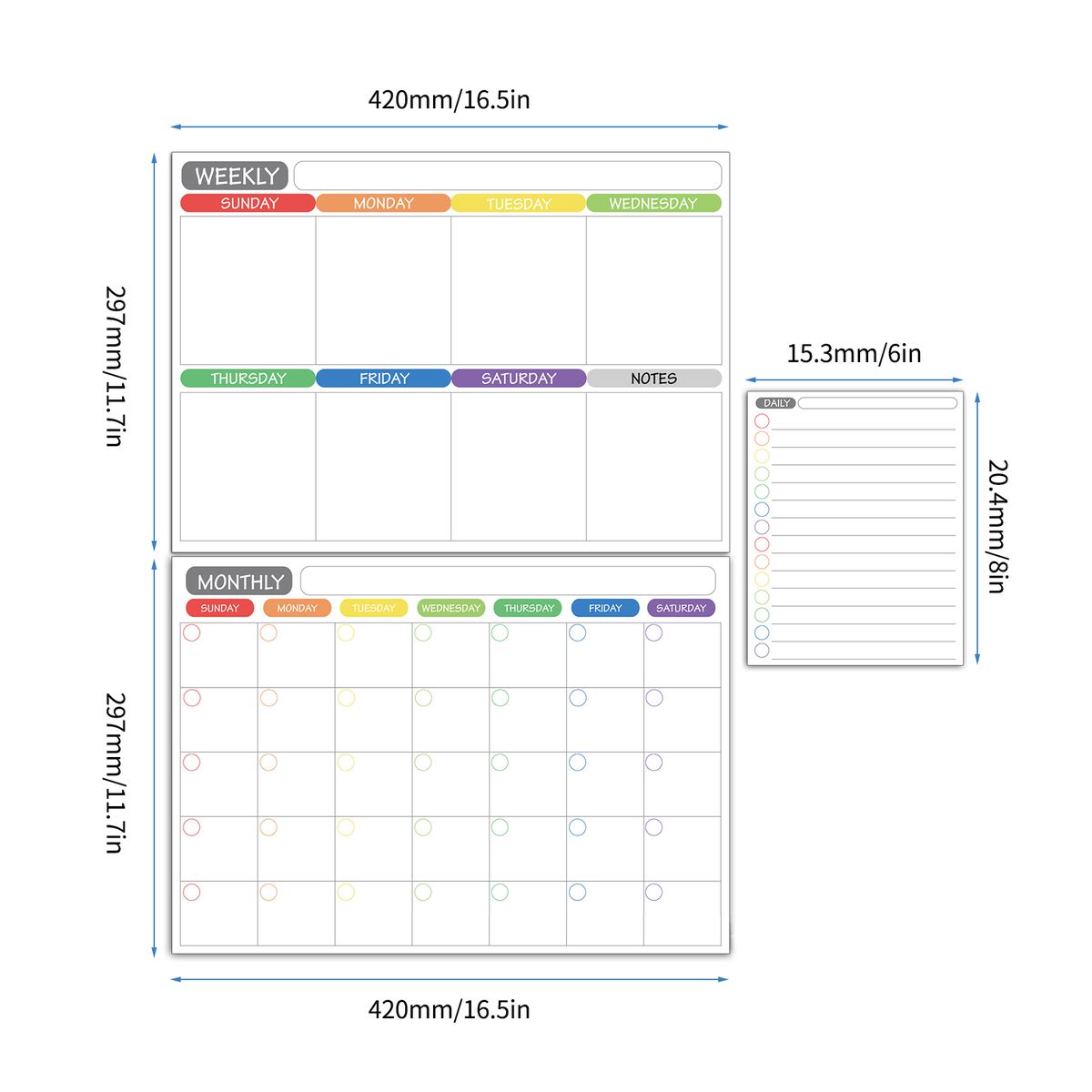 ✏️ Organize Your Life: All in one package including 3 magnetic dry erase planners - monthly, weekly and daily mode. 5PCS colorful whiteboard pen - red, orange, yellow, green, blue and black, and 1pcs eraser. Two of the boards are A3 size (297x420mm/11.7x16.5in), a large space for you to writing down any information and plan your life.