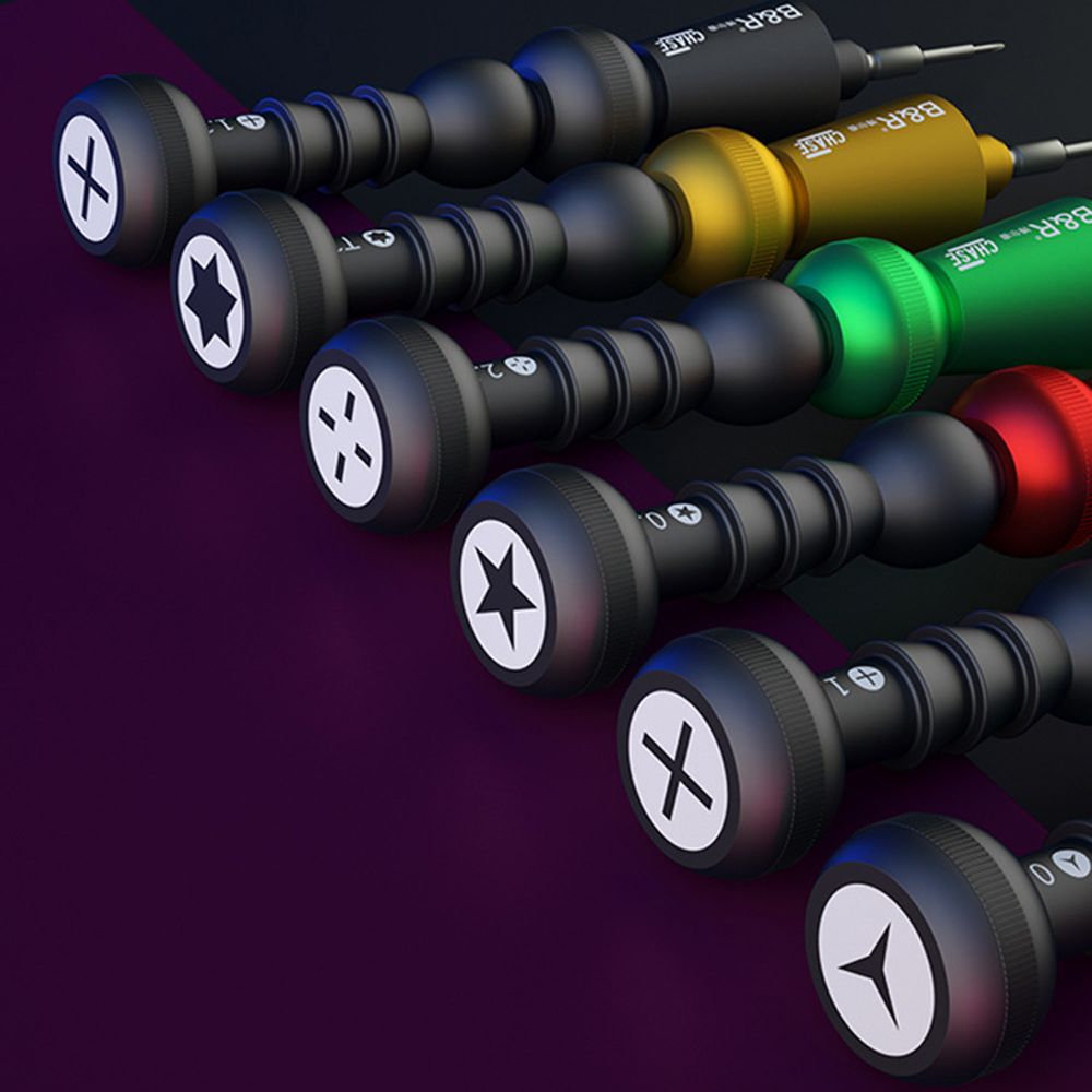 Each kind of screwdriver has a different color and icon to quickly find the one you need.