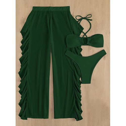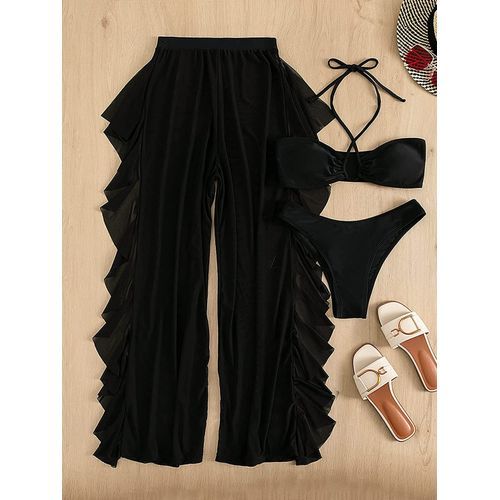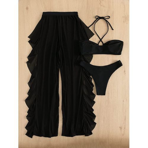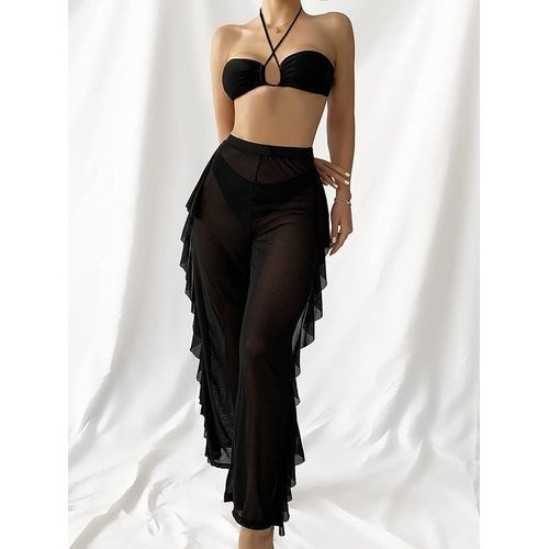 - Feature: halter high cut bikini set, sheer mesh ruffle cover up pant, casual plain 3 piece swimsuit for women