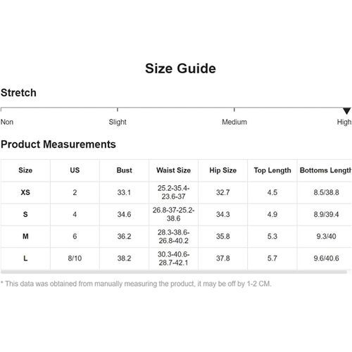 Size Chart: X-Small——Bust:33.1", Waist Size:25.2-35.4-23.6-37", Hip Size:32.7", Top Length:4.5", Bottoms Length:8.5/38.8"/ Small——Bust:34.6", Waist Size:26.8-37-25.2-38.6", Hip Size:34.3", Top Length:4.9", Bottoms Length:8.9/39.4"/ Medium——Bust:36.2", Waist Size:28.3-38.6-26.8-40.2", Hip Size:35.8", Top Length:5.3", Bottoms Length:9.3/40"/ Large——Bust:38.2", Waist Size:30.3-40.6-28.7-42.1", Hip Size:37.8", Top Length:5.7", Bottoms Length:9.6/40.6"/
