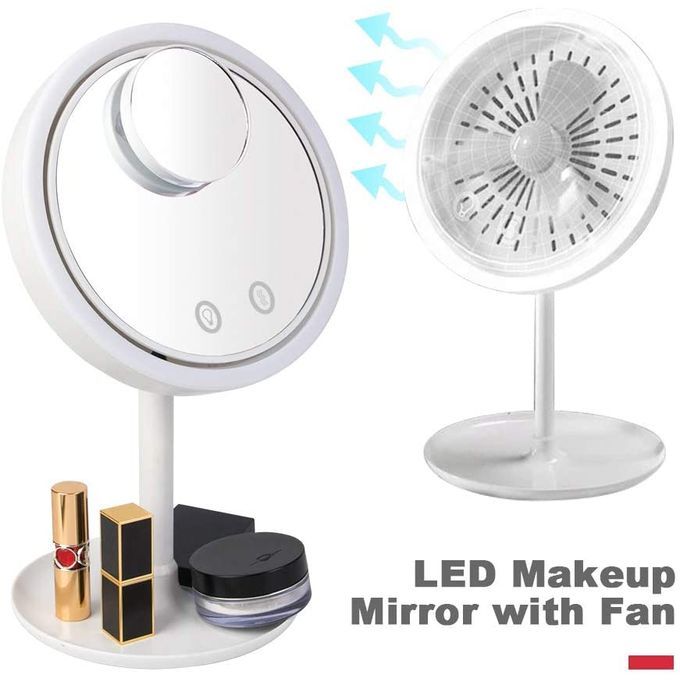 Unique mirror with a quiet built in fan that distributes a gentle breeze to keep your skin cool as you apply makeup