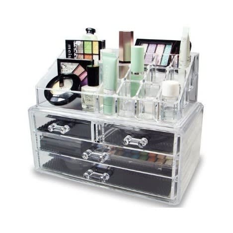 The stylish and modern acrylic storage case adds refinement to any makeup collection. This storage case is made of acrylic which is a clear plastic always being able to see your makeup right when you need it. Turn all your loose makeup and cosmetics into your very own beautiful beauty counter. This makeup storage case can be conveniently stored in bathrooms, vanity counters, dressers, and most tabletops. This organizer is a special gift at any age and stage in life.