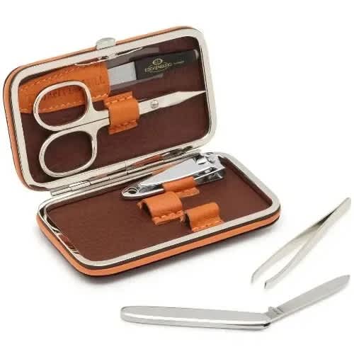 Stainless steel manicure and beauty tools. Have increased cutting force and special polishing technology to assure clean and easy nail trimming. There are a large one and a smaller one for different nail sizes. They are specially designed for trimming hard fingernails and toenails. Ideal blade structure and angle for effectively trimming cuticles. Perfect for exfoliation treatment around finger. All those 14 tools are gathered in a delicate leather case.