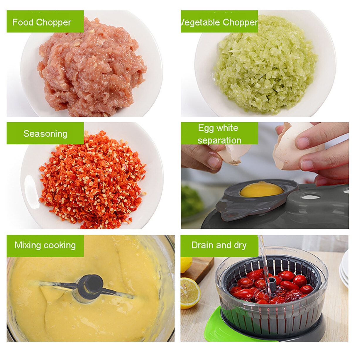 PERFECT DESIGN: This manual hand crank food chopper contain 3 sharp cut all kinds of ingredients. a blending vanes mixes eggs, and so on, an egg separator can separate egg white and egg yellow completely.