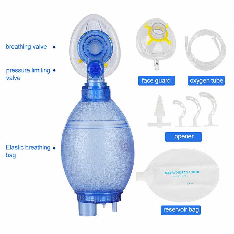 #Adult type: 1 x PVC Respiratory Balloon 1 x Face Guard 1 x Oxygen Tube 1 x Opener 1 x Reservoir Bag 1 x Storage Box #Kid type 1 x PVC Respiratory Balloon 1 x Face Guard 3 x Oropharyngeal Airways 1 x Oxygen Tube 1 x Opener 1 x Reservoir Bag 1 x Storage Box