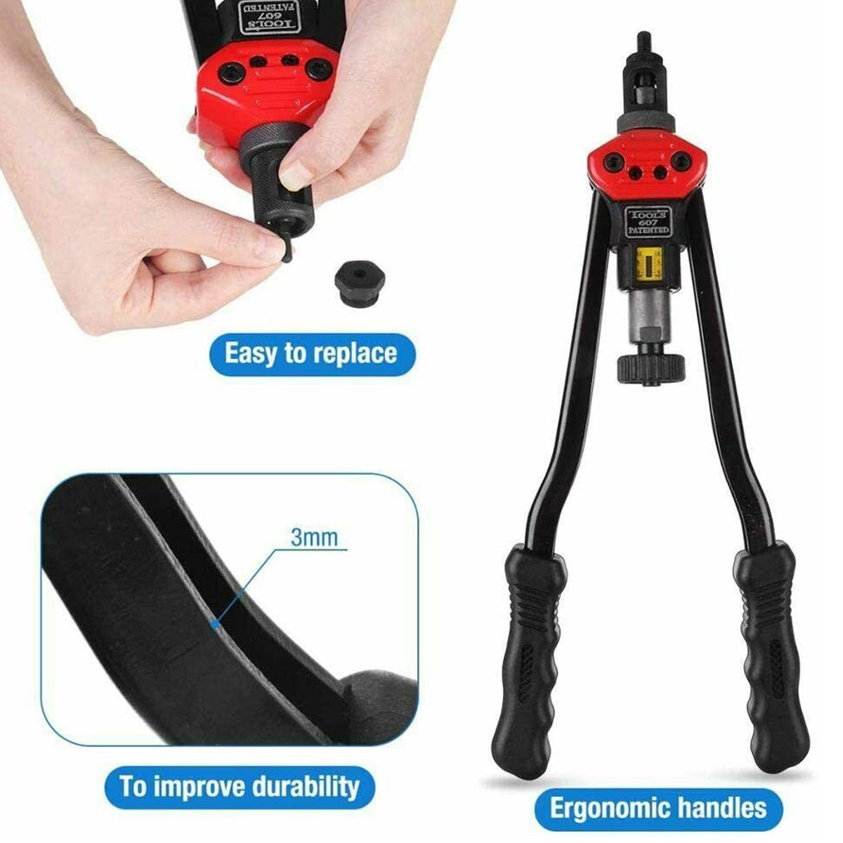 High strength manual nut riveting suit, simple operation, easy to use, reliable performance. Carbon steel arm, high hardness, flexible moving, ergonomic treatment of double hinged levers, appliable for wide riveting work needs.