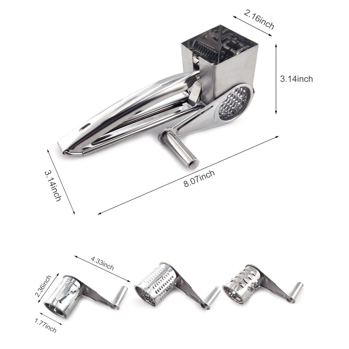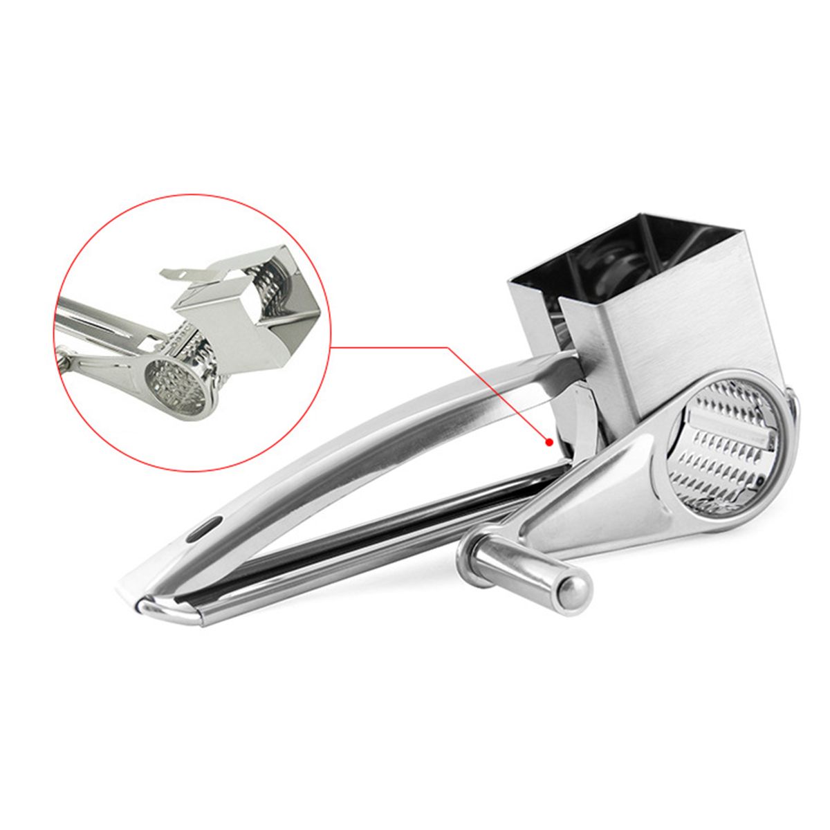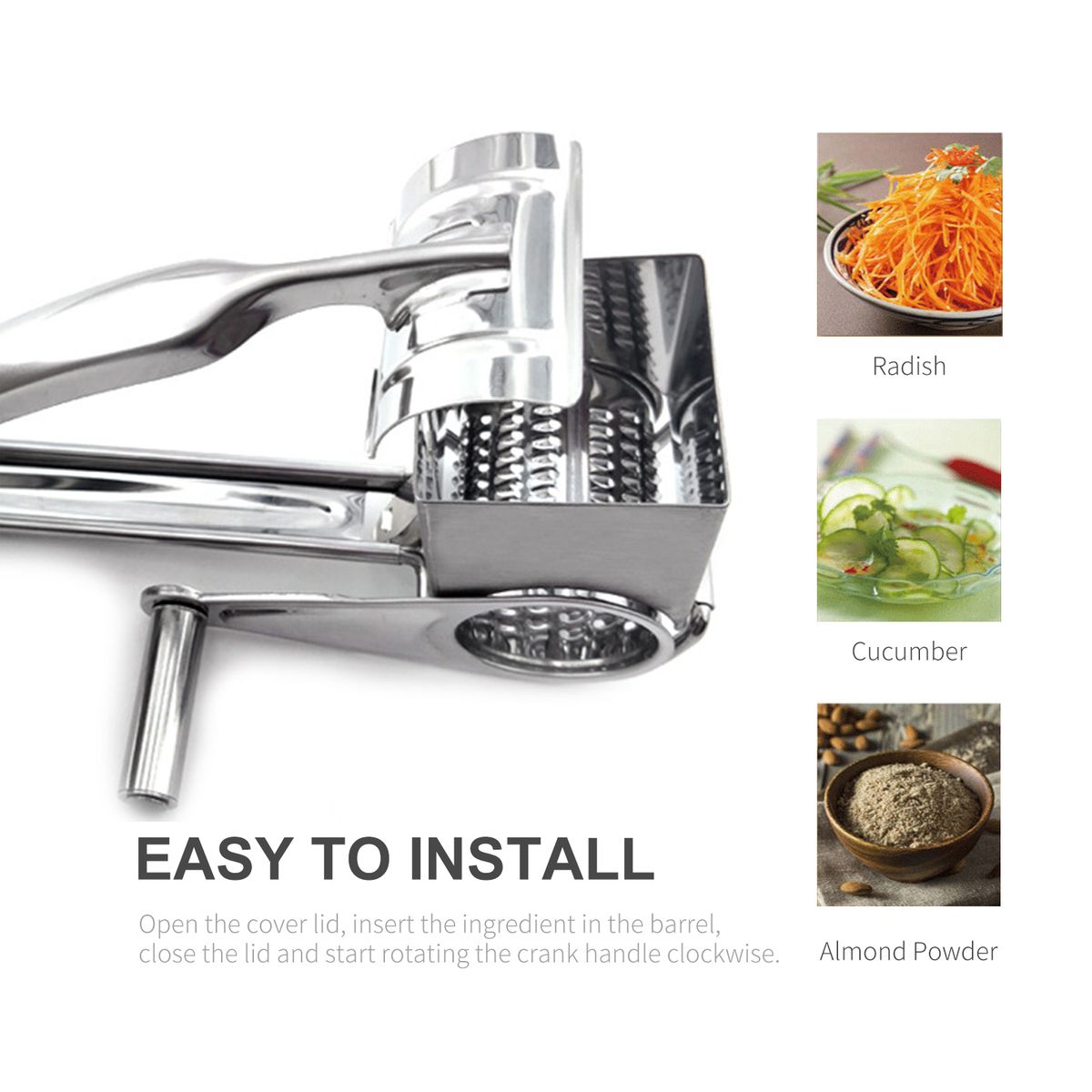 1.Handheld rotary grater for hard cheese, chocolate, nuts, pistachio, almonds, dried coconut, carrot, potato, and more.