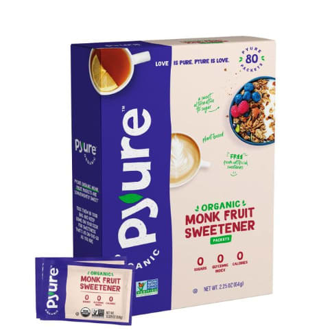 Pyure Organic Monk Fruit Sweetener provides the same taste, texture, and feel as traditional sugar without the added calories or carbohydrates. This sugar substitute is super sweet, so you only need a small amount. There's no bitterness or aftertaste, and it mixes and dissolves well.