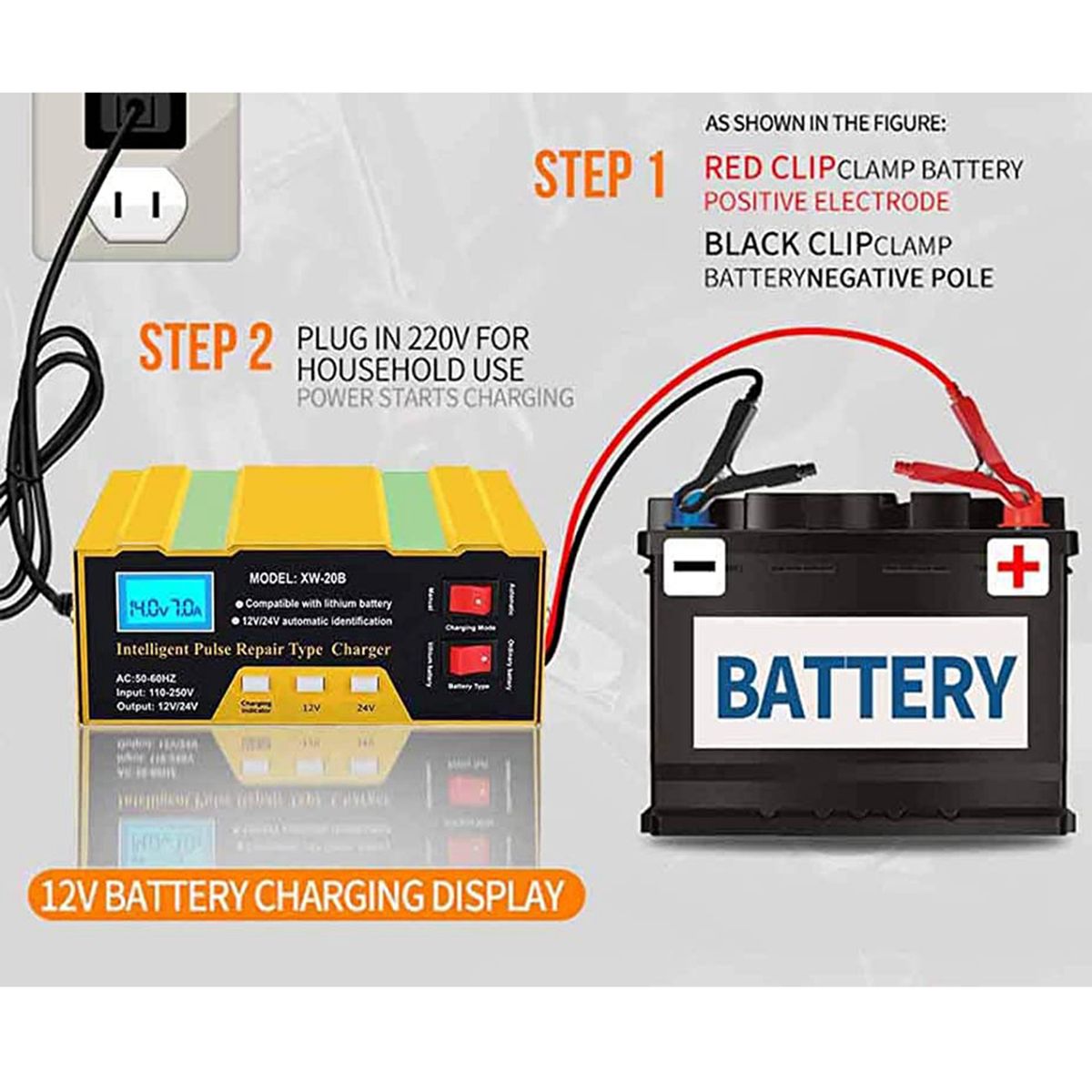 It's compatible with all kinds of 12V /24V lead-acid battery, water battery, maintenance-free battery, dry battery charging. etc. (VELA BATTERY , BATTERY,OPZN BATTERY)(Battery Not Include)For Cars, SUVs, motorcycles, electric vehicles, small trucks, tractors and other types of vehicles.12v/24v universal automatic identification.Compatible with 12.6V polymer lithium battery.Full charge automatically stops output current.Digital display: current, voltage, power and charging state in different stages.The current can be adjusted manually, automatic and manual charging mode, more reliable.