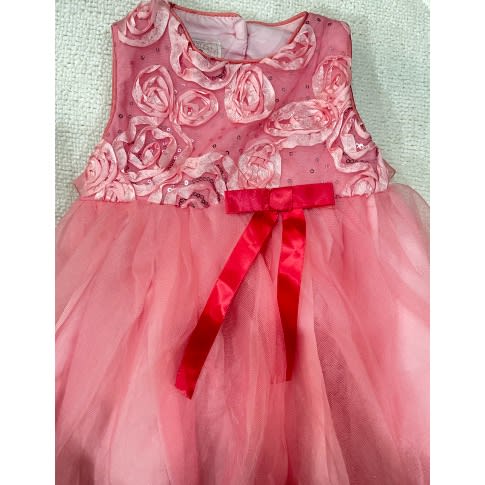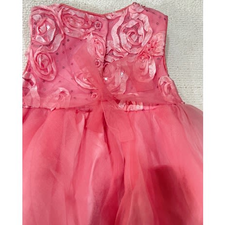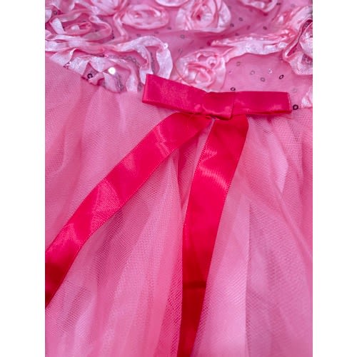 Pastel, 3D floral mesh, sleeveless, bodice and off centered, satin bow to full mesh skirt with tri-color, satin ribbon detail and hem.