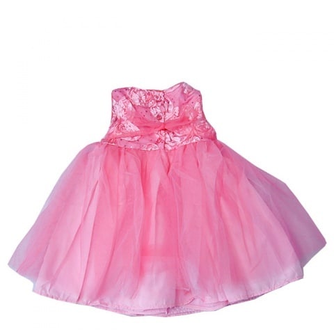 white & Pink Floral gown with pinks & blues flower design. Sleeveless dress with a bow and bottom of dress puffs out too, the dress has a baby pant inside. This dress is perfect for newborn to 12mnt.