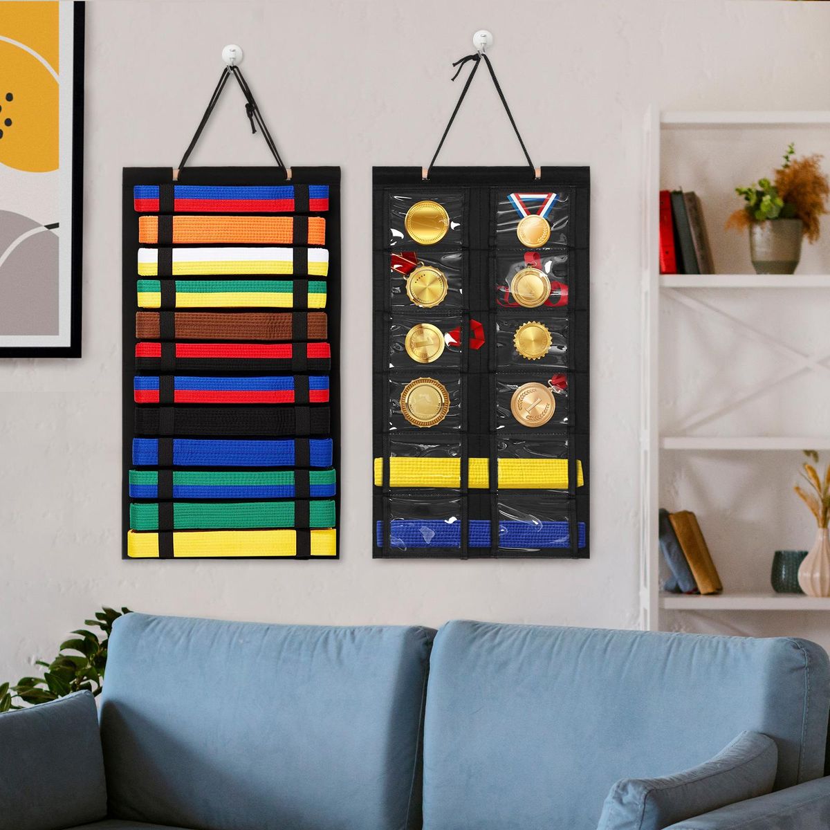 【Karate Belt Display Holder】: It can hold 12 belts and multiple medals, keeping belts and medals organized and looking clean and tidy.【High Quality Material】: Martial arts belt organizer is made of high quality material, which is wear resistant and durable and can be used for a long time.【Space Saving】: Taekwondo belt display holder can be hung on the wall, door, closet or anywhere you want to display it in your home.【Multipurpose】: Hanging medal rack 35cmx62cm, lightweight and foldable, perfect for karate belts, martial arts belts, taekwondo belts, etc.【Perfect Gift】: A martial arts belt holder is the perfect gift for martial arts learners, not only to showcase the honour of their travel but also to inspire them to keep going.