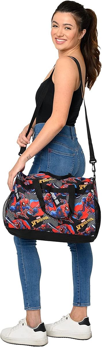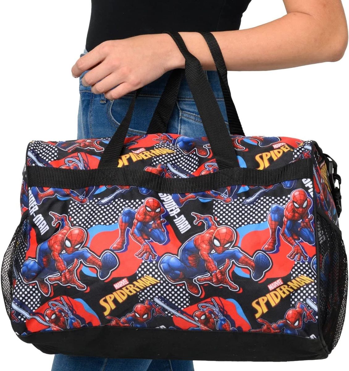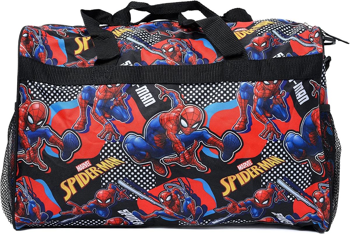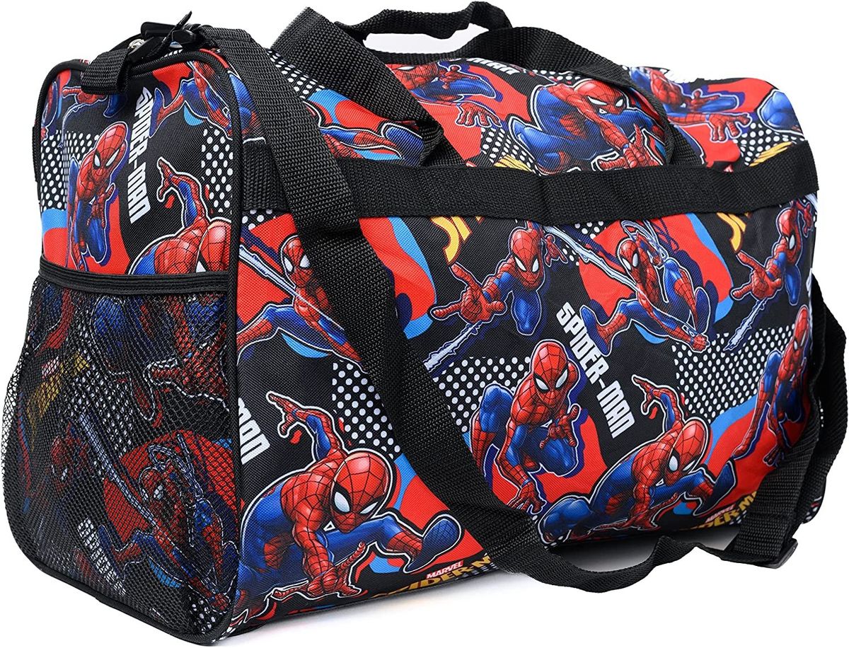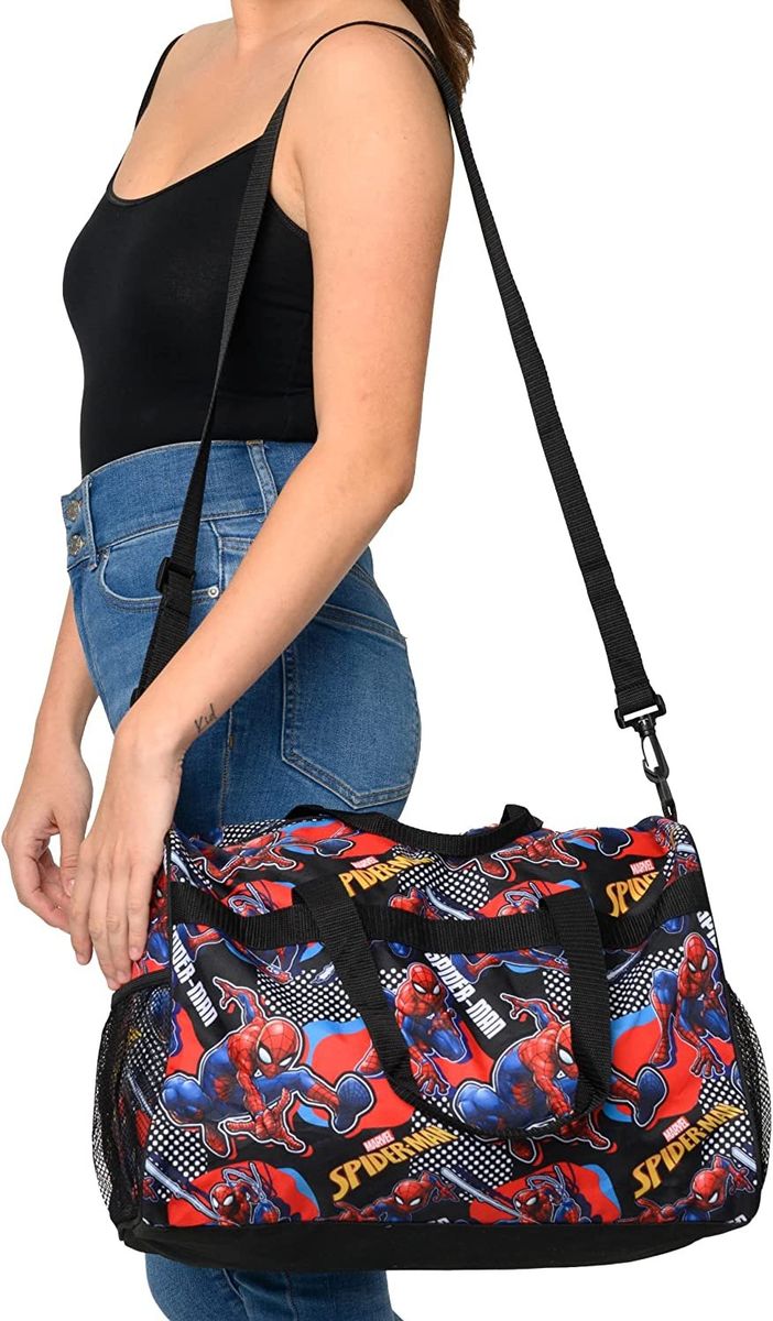 Marvel Duffel Bag - officially licensed. The duffel has a zipper opening for the main compartment, double handles, adjustable shoulder strap and mesh/net pockets on both sides. Duffel bag measures approximately 16" x 11" x 9".