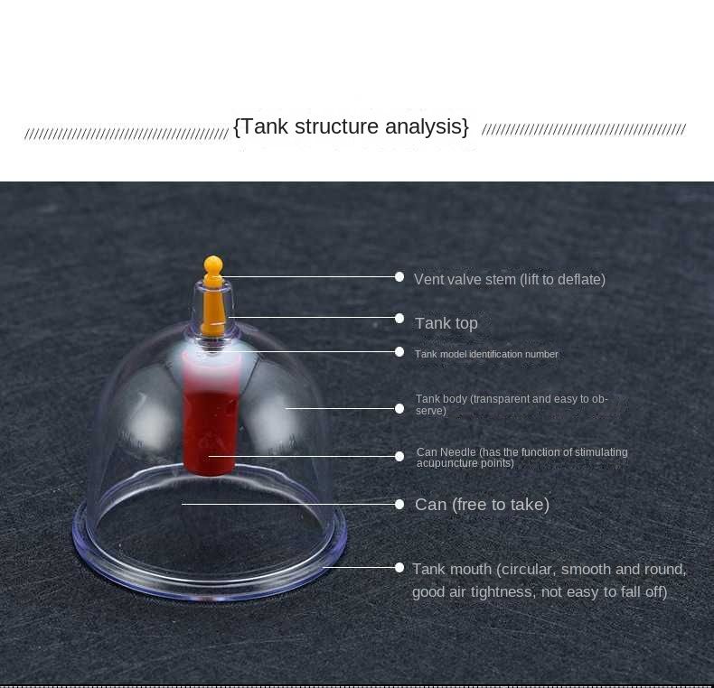 Durable, strong and crash-resistant.The internal pressure adjustment is convenient, and the internal processing is clear at a glance.The smooth, rounded rim expands the contact area with the skin and ensures an optimal seal.No need for fire and electricity, safe and reliable, easy to operate.Type massage jarmaterial plasticFeatures cupping therapy, with vacuum pump, pain reliefnotesDue to different lighting and screen settings, the color of the item may be slightly different from the picture.Please allow slight size differences due to different manual measurements.Package includes6.9cm*4,6cm*4,5.3cm*4,4.5cm*4,3.5cm*4,4.5cm*2,3.5cm*2 |
