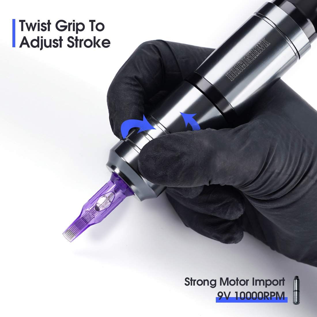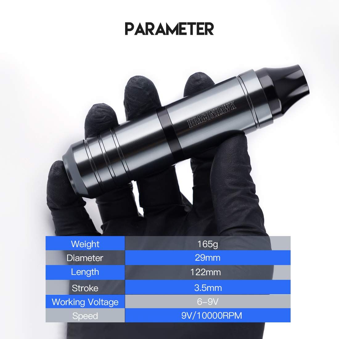 Weight 165 g, diameter 29 mm, stroke 3.5 mm, motor speed 9 V/10000 rpm. Tattoo pen suitable for lining, shading, colouring, packing.