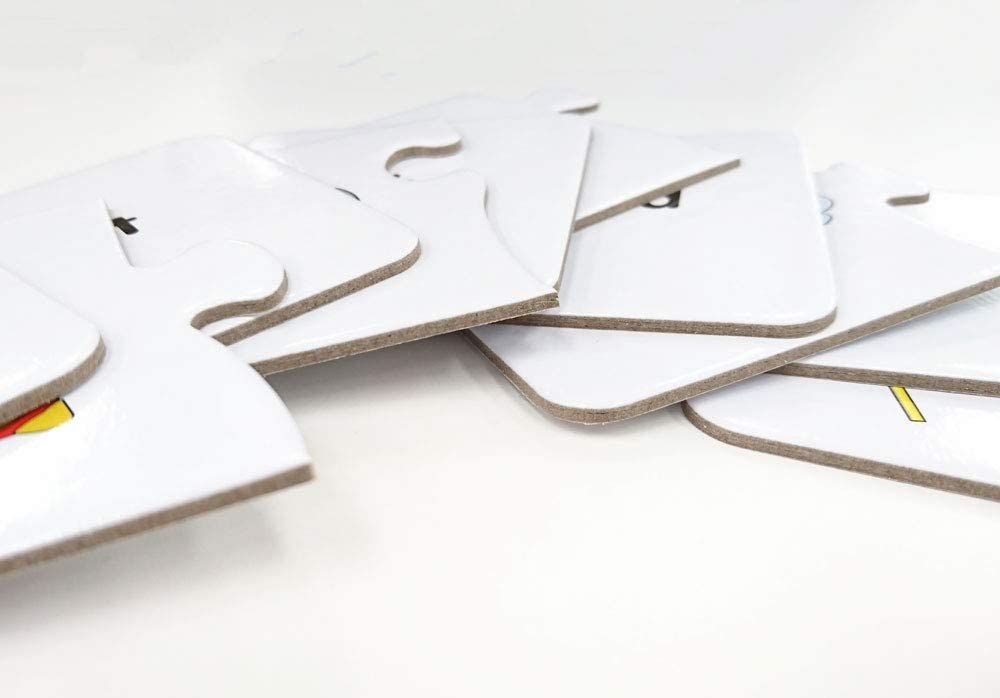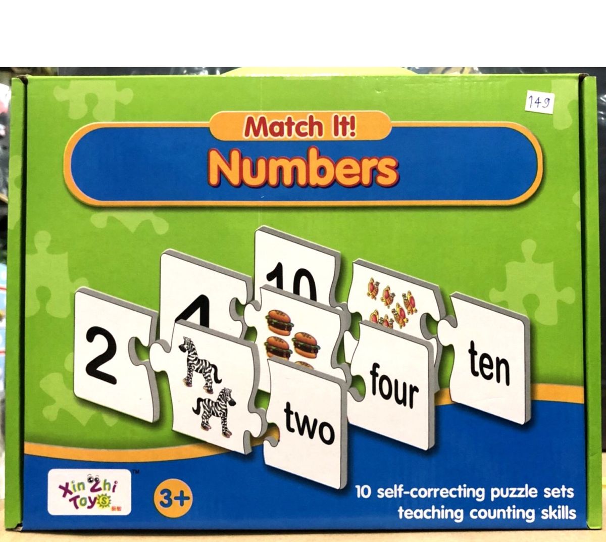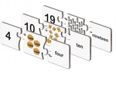 Each puzzle card has three pieces: the numeral, the same number of objects to count, and the number in written form. By simply matching the pieces together, children will learn to recognize the numeral and spelling of the numbers. The puzzles are also self-correcting. Ten puzzle sets included.