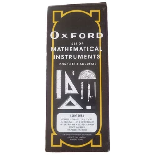 The world's best known maths set and brand leader in the UK.9 piece maths set.Traditional Metal tin containing self centering compass and pencil, ruler, protractor, set squares, stencil, eraser, sharpener & timetable/fact sheet.Safety point compass & Anti-tamper screw on pencil sharpenerThe perfect maths set for students studying a range of subjects including maths, geometry, trigonometry and design technology. The set includes a 9cm Pencil, 15cm /6" rule, a Stencil, Metal Self-centring compass, 180 degree protractor, set squares, timetable/fact sheet , sharpener and eraser all presented neatly in a metal storage tin featuring the traditional Oxford design.It has a worldwide reputation for quality and excellence with an enviable brand that is known for using its traditional values of product development and applying them to modern day curriculum requirements. Known across the globe as the world's best maths set.It was founded 130 years ago in the Midlands, England with a view to offer customers high quality, sturdy and durable stationery to use every day in school, at home or in work. Today product range may have grown from where it all started 130 years ago but it still has the love and passion for stationery that it always had, as well as the desire to offer people the best of British design and function in their everyday stationery use.PVC, Phthalate and Latex free eraser