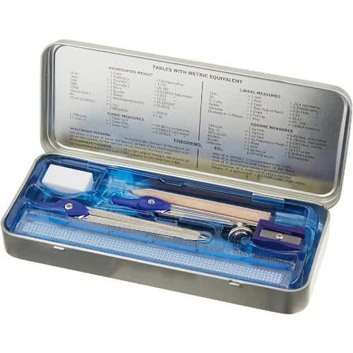 instruments. Contents include:Metal CompassMetal DividerPencilsRulerEraserPencil sharpener45 & deg; and 60 & deg; Set squares180 & deg; protractorPenTimetable