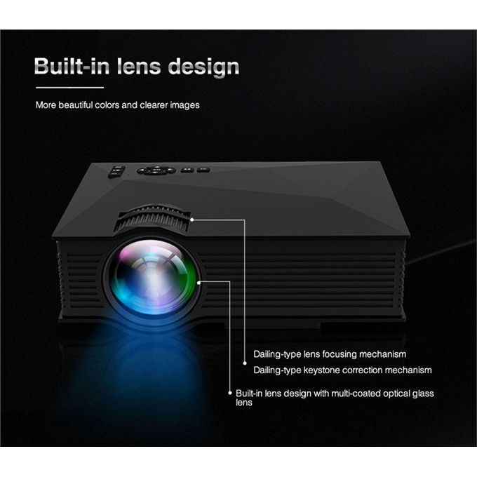 //////////////Parameter:"Image system: TFT lcdBrightness: UC46+/1200 lumens = 50ANSI , UC68/1800 lumens = 80ANSIAspect ratio: 4: 3/16: 9LCD Contrast Ratio: 800: 1Own Resolution: up to 800 * 480 RGBResolution Support: up to 1920 * 1080 pixelsLED lamp using life: more than 20,000 hours (at least ten times longer than a traditional projector lamp)Lens: F = 125Viewing distance: 1,07 ~ 3,8 mProjection size: 34 ~ 130inKeystone Keystone Correction: ± 15 degreesManagement: ManualPower consumption: 55 W (Max)USB Output: 5Vout-500mAPower supply: 100 V ~ 240 V / 0.9a (max) 50 / 60HzMain Features:1800 lumens for clear and bright images.High quality multi-purity optical lens provides better color reproduction, better transfer and better temperature resistance.Maximum Resolution: 1080 P for a display of 34 ~ 130 inches (s) within 1 ~ 3 m brings you a gentle visual experience.With rich interfaces, HDMI, VGA, 3in1 AV port, dual standard USB ports, an SD card slot and a 3.5mm headphone jack.With the remote control, it is convenient for you to use.