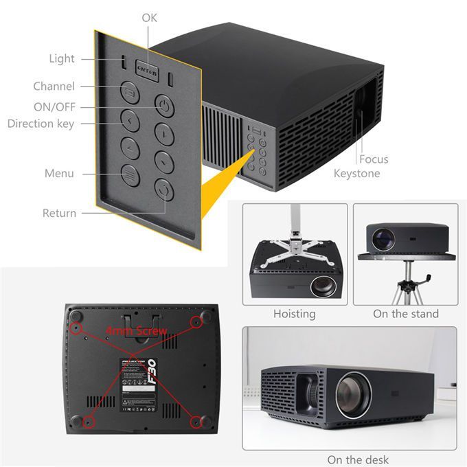 LED illumination System, Life Time: 50,000 HoursF30 can stay with you for 20 years with 5 hours usage per day123_15Throw RatioResolution ration:1920*1080, projector size:60-150inch,distacnce from 2-4.5MeterBest in 100 inch, 3 Meter8