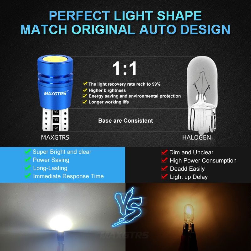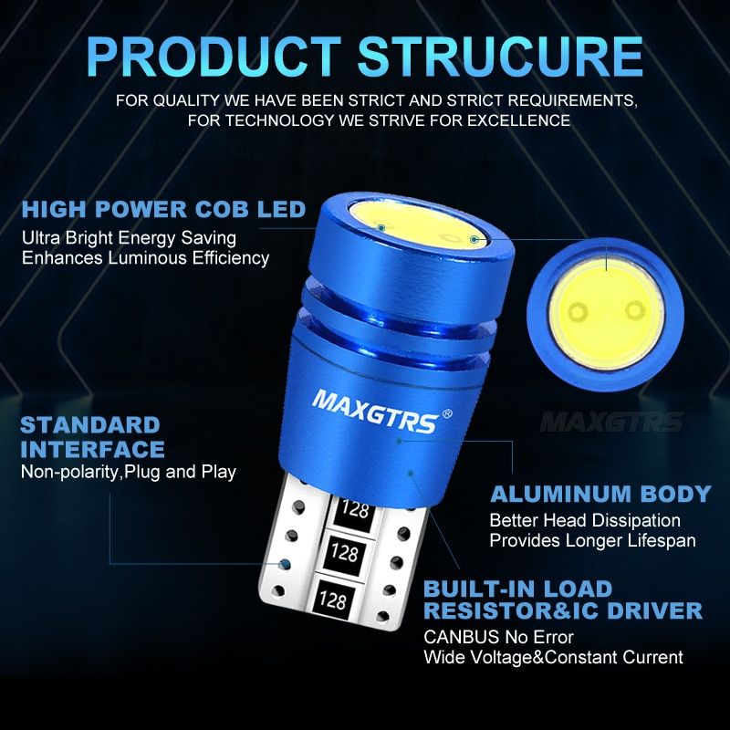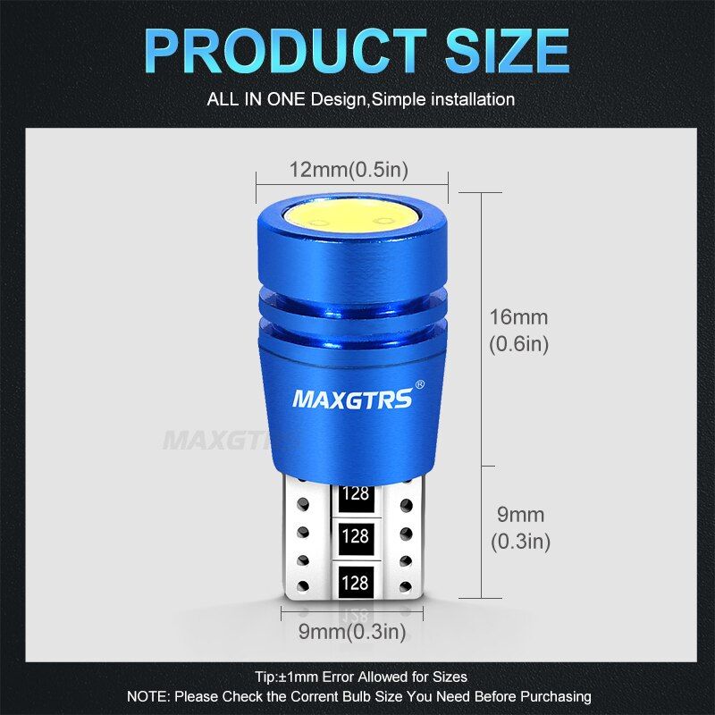 2Pcs/Lot 2019 New Super Bright White Shell T10 Canbus Can-bus No OBC Error 194 W5W Led Car Instrument Side Lights Description Base: T10 w5w 194 Light Chip: Ultra bright COB LED Quantity: 2 Operating Voltage: 12V/24V Feature - Super bright with COB - CANBUS, Error Free - Aluminum case for better heat diipation Package Includes 2 Pcs T10 Canbus error free What is COB? COB (Chips on Board) is a new technology of LED packaging of LED light engine. Multi LED chips are packaged together as one light module. When it lights up, it looks like a lighting panel. How COB LED light source works? In COB lighting, single LED chips are placed directly on a circuit board (or substrate) which has thermal properties to disperse heat. Heat diipation is a very ant aspect of LED lighting since it can have a major impact on the life expectancy of the luminary. Therefore, COB lighting can have a higher LED chip density and achieve higher light level while maintaining or improving life expectancy. Advantage of COB COB lights are a more efficient form of LED lighting for general or automotive lighting applications because: - light has a more uniform appearance - better life expectancy - achieve higher light level over a large area - COB is more stable and reliable than standard LED package Note **Please check Socket of your old lamp before purchasing** ***We recommend profeional installation.
