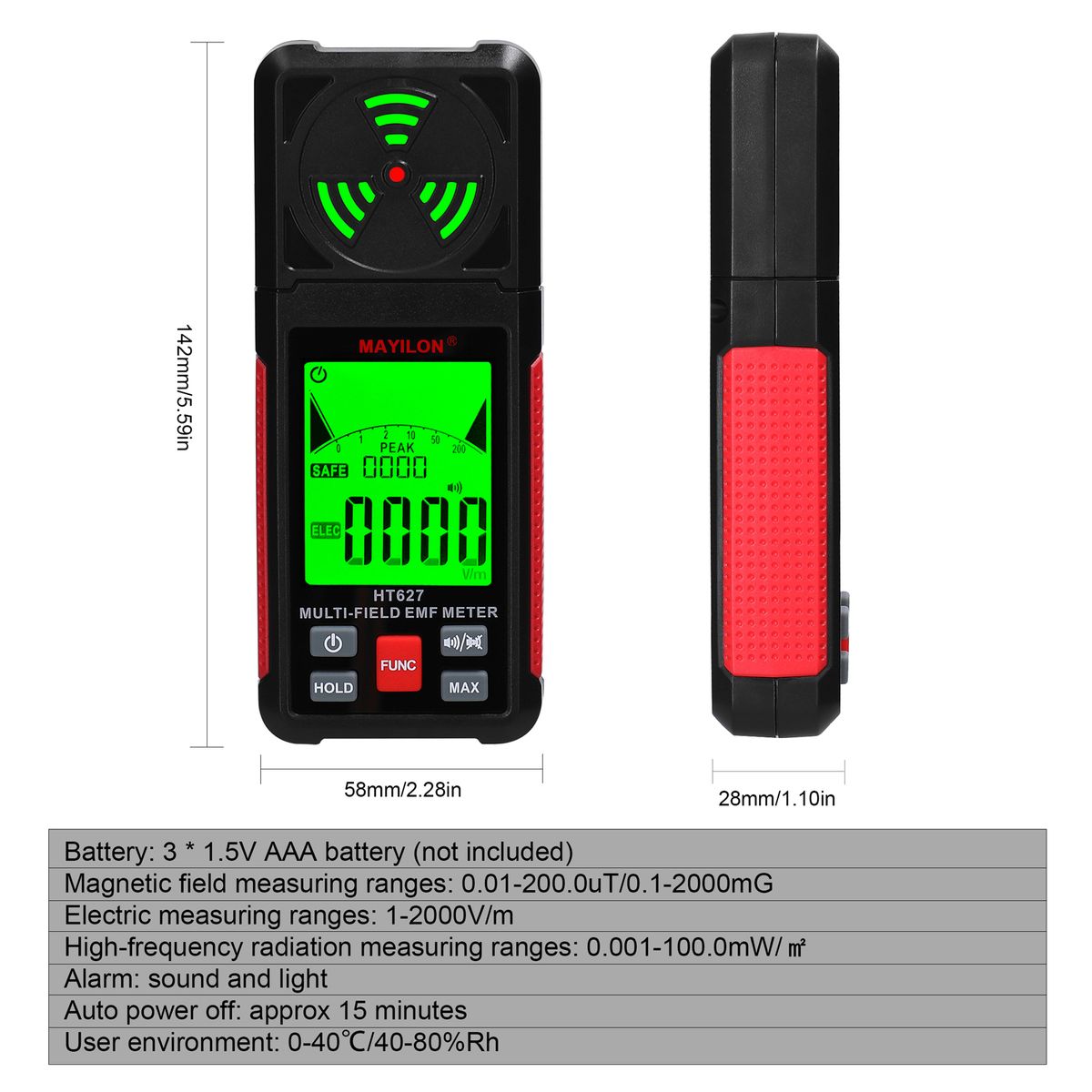 The handheld EMF meter is mainly used to detect the electric field, magnetic field and high-frequency radiation. Built-in high-precise magnetic field electric field sensors, and equipped with a quality sensing probe for and sensitive detection. Multiple measurement mode selection supports manual switching between magnetic field measurement, electric field measurement, and high-frequency measurement modes. With automatic ower off, maximum value measurement, and data hold function.