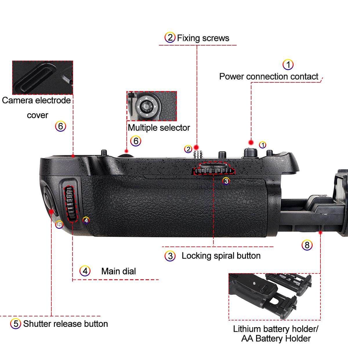2.Can hold 1 x rechargeable Li-ion batteries(EN-EL15) or 8 x AA batteries, effectively increasing the camera operating time.