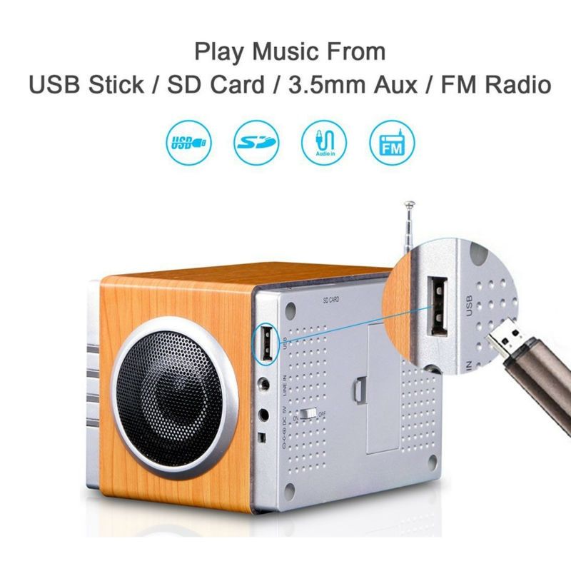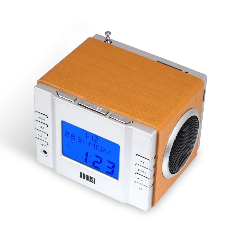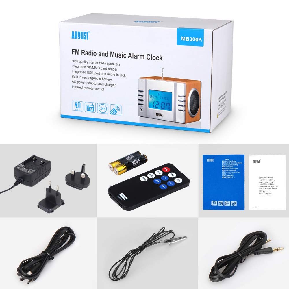 1X August MB300 Wood Mini Portable Radio Receiver with MP3 Player FM Radio USB In/Aux IN/SD Card/Alarm Clock Speakers Rechargeable
