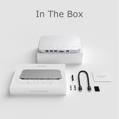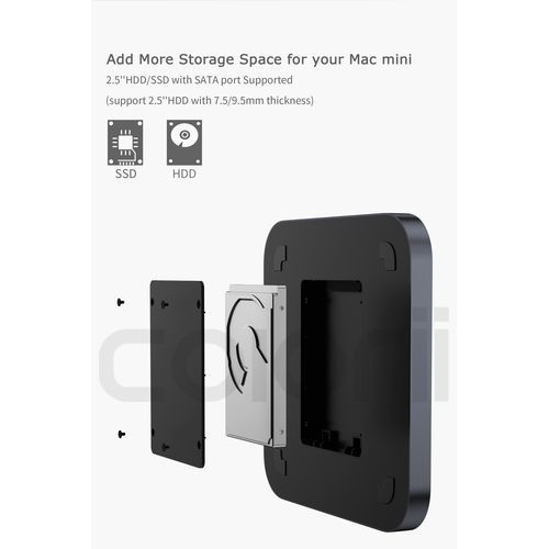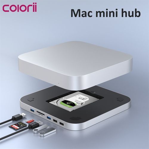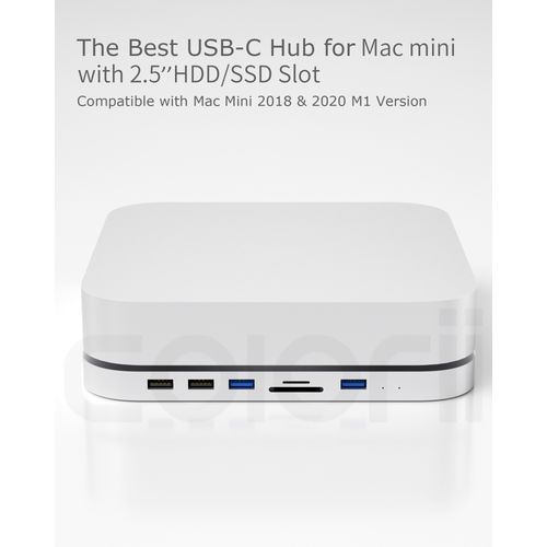 World's first hub for Mac miniBoth a Mac mini stand and USB-C hub - all using a single Type-C connection7-IN-1 EXPANSION PORTS - two USB 3.0 ports, two USB 2.0 ports ,micro/SD card readers, 2.5' HDD slot in the bottom 2.5' SATA HDD/SSD slot ----Storage extension up to 2TB The same size and sleek design-- feel like a natural extension of your Mac Mini Please note: there may be slight differences in color due to Mac Mini variations and manufacturing processesCompatible with Mac Mini (2018 & Later)For Mac mini 2017 and previous version, we provide a Type c to USB A adaptor. So MC25 also works on other Mac mini version with USB A 3.0 port.PrecautionThis is only a USB C HUB, HDD is not included.What can it do?1.as a HDD enclosure,it can extend your storage for your mac mini or other laptop2.a big usb c card reader :)3.turn all interface aheadHow to connect to Mac miniType C to USB A +Type C cable is included in the package.1.For Mac mini 2018 and later :Type c to Type C cable2.For Mac mini 2017 and previous:Type c to USB A 3.0COMPATIBILITYsupports Mac Mini with Type-C ports (2018 & later). For 2017 and older Mac Mini models,need to connect to USB A port on Mac miniPackage list1.MC25 hub(HDD not included)2.usb c to usb c +USB A cable(25cm length)3.screw driverColorii MC25 Silver Silver M1 Mac Mini Hub Ssd Hard Drive Enclosure Docking Station with card reader