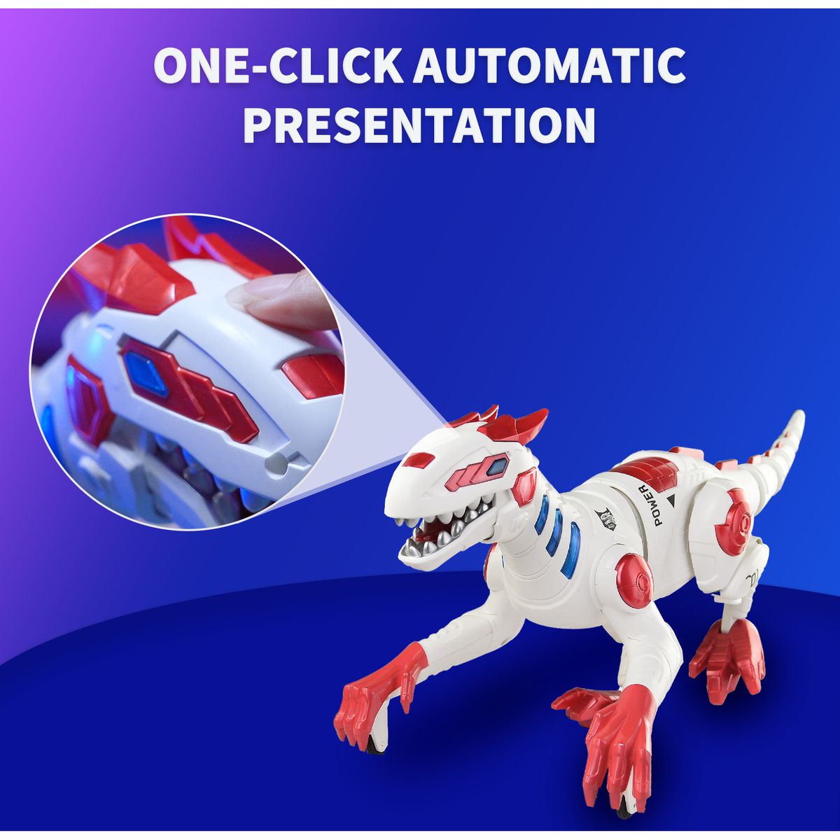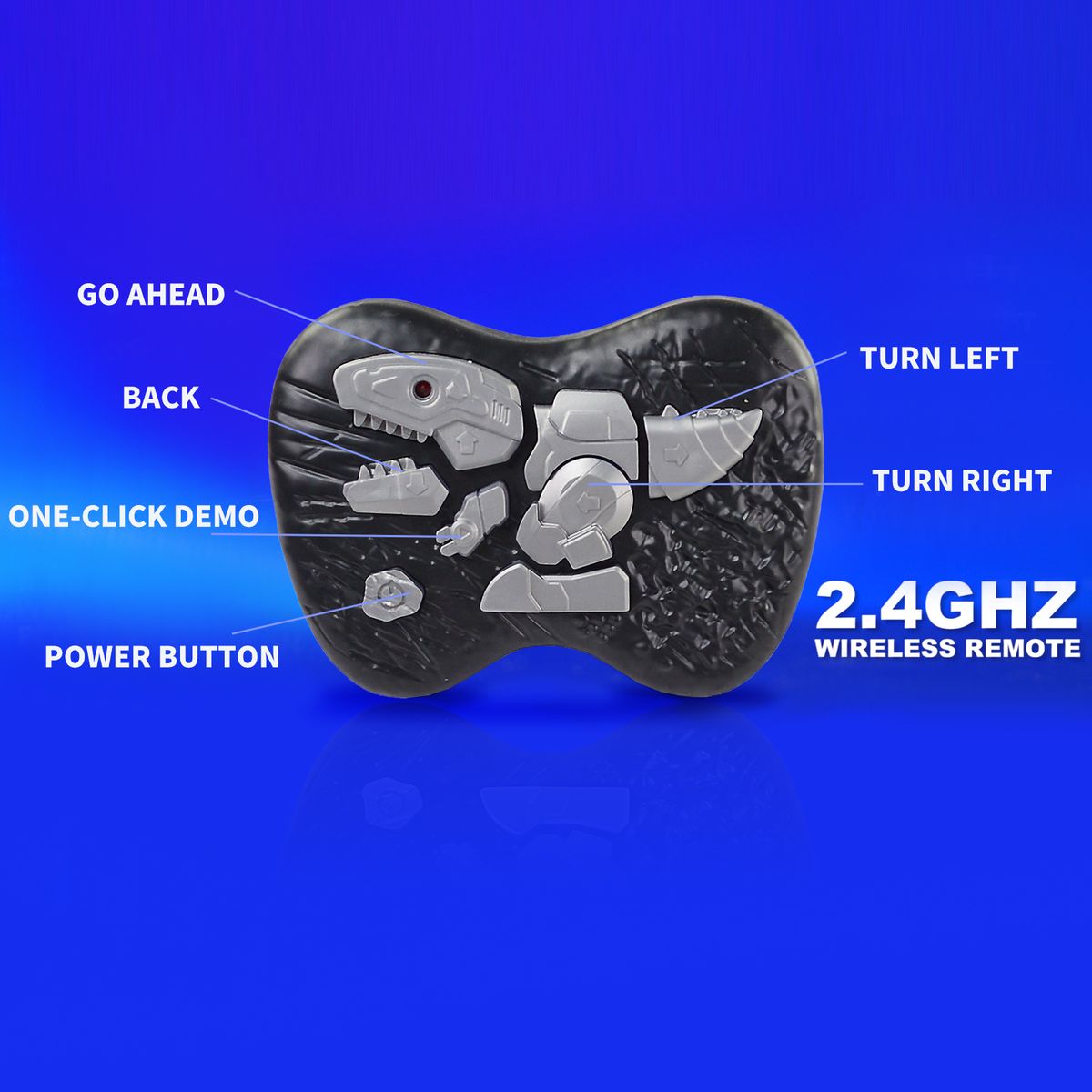 This Intelligent RC dinosaur toy features with go forward / backward, turn right / left, 2.4GHz wireless remote control, one-click automatic presentation function, cool breathing lights and simulation sound effect and many other features, it\'s a perfect gift for a dinosaur-loving child, also a great educational tool for kids to learn more about dinosaur and prehistoric culture.