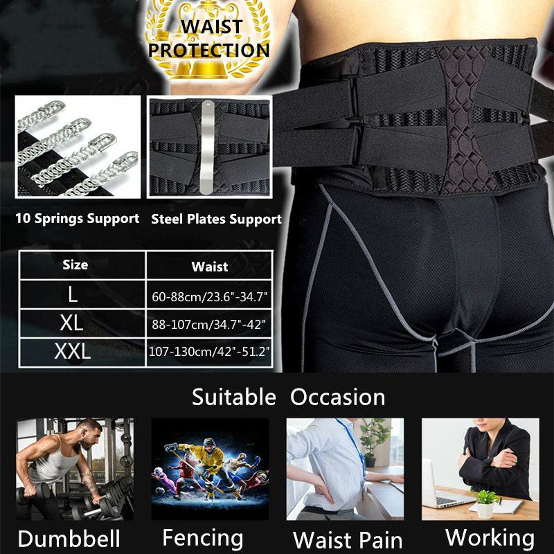 Medical Back Brace Waist Trainer Belt Spine Support Men Women Breathable Lumbar Corset Orthopedic Faja Lumbar Hombre Gym BeltsSize:L: Fits waist circumference: 60-88cm / 23.6-34.6 inch;XL: Fits waist circumference: 88-106cm / 34.6-41.7 inch;XXL: Fits waist circumference: 106-130cm / 41.7-51.2 inch;Features:【Relieve LOWER BACK PAIN 】The Back brace contains 1 Steel Plate support and 10 Memory springs stays that are quadruple harder than the commonly used PP strips,and 2 steel springs placed along the waist side, offer 360° stronger vertical support to lower back,prevent excessive rolling of your muscles and decrease the pressure on your discs .【Well wear under clothes】The back support made of 4-way stretch elastic material,3D knitting technology by different compression levels, for superior fit,breath and comfort. The inner layer is made of veet fabric, giving an ultimate baby-skin-like silky touch,perfect for dressing internally.【PREVENT BACK INJURIES】Back support with 2 elastic straps are designed to add extra compression around lower back to prevent back injuries from weight lifting, long time standing or sitting, doing housework, working, etc. Relief waist muscles ache, disc herniation, sciatica, scoliosis etc when wearing the back belt.【CONSIDERATE DETAIL DESIGN】The wide size hook and loop fasteners of 2 elastic straps provides strong adhesion far beyond your expectations, made of soft and breathable fabric,will not scratch your skin or damage your clothes.【Durable & SATISFIED SERVICE】The waist support adopts double seams, the quality is strictly controlled, and it is very durable.Medical Back Brace Waist Trainer Belt Spine Support Men Women Breathable Lumbar Corset Orthopedic Faja Lumbar Hombre Gym BeltsMedical Back Brace Waist Trainer Belt Spine Support Men Women Breathable Lumbar Corset Orthopedic Faja Lumbar Hombre Gym Belts